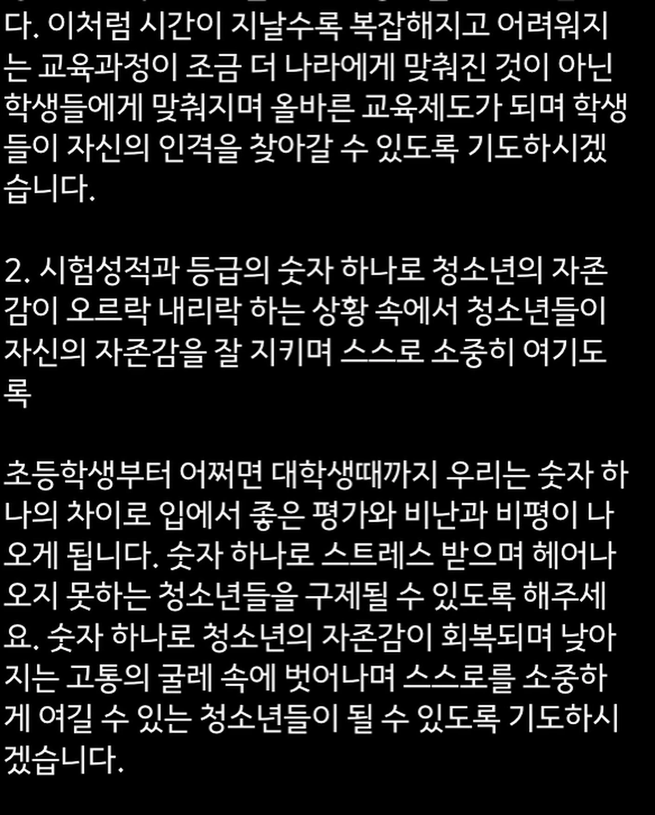 초등학생부터 어쩌면 대학생때까지 우리는 숫자 하나의 차이로 입에서 좋은 평가와 비난과 비평이 나오게 됩니다. 숫자 하나로 스트레스 받으며 헤어나오지 못하는 청소년들을 구제될 수 있도록 해주세요. 숫자 하나로 청소년의 자존감이 회복되며 낮아지는 고통의 굴레 속에 벗어나며 스스로를 소중하게 여길 수 있는 청소년들이 될 수 있도록 기도하시겠습니다.