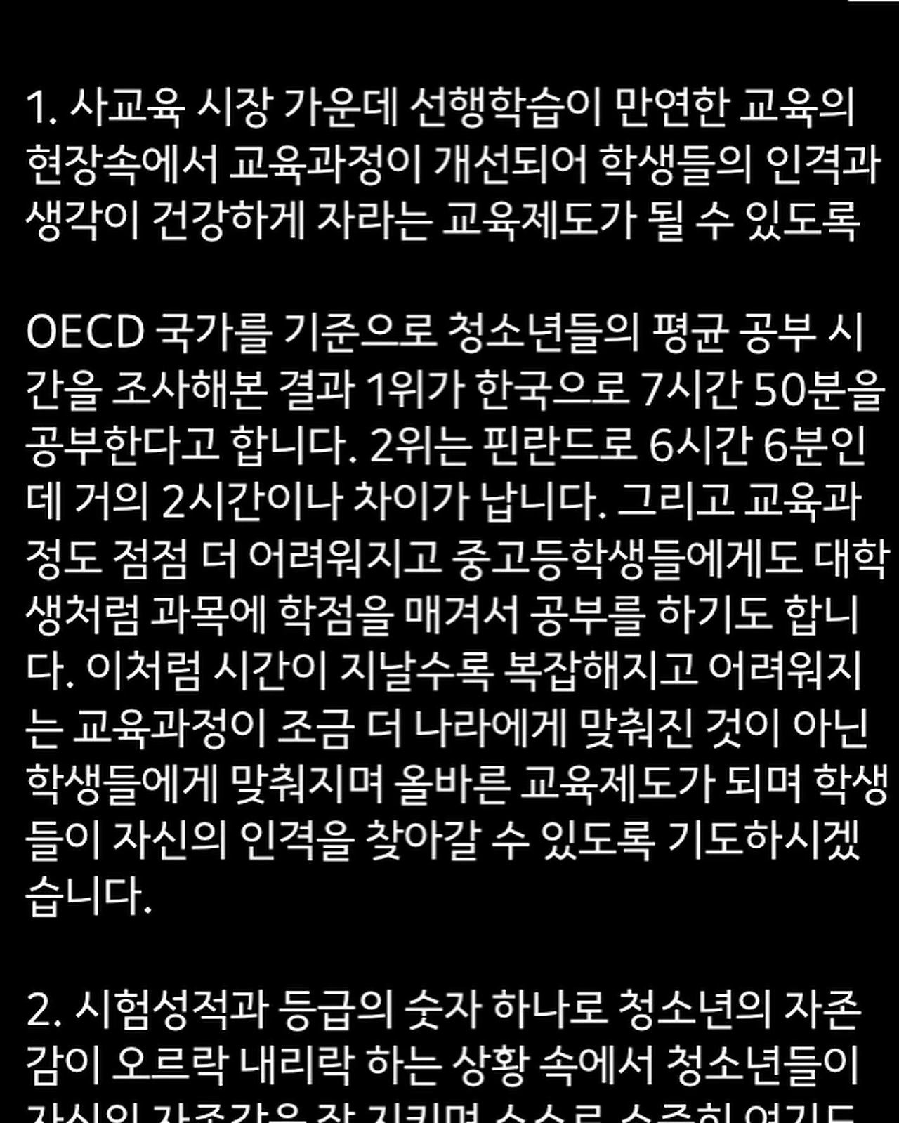 OECD 국가를 기준으로 청소년들의 평균 공부 시간을 조사해본 결과 1위가 한국으로 7시간 50분을 공부한다고 합니다. 2위는 핀란드로 6시간 6분인데 거의 2시간이나 차이가 납니다. 그리고 교육과정도 점점 더 어려워지고 중고등학생들에게도 대학생처럼 과목에 학점을 매겨서 공부를 하기도 합니다. 이처럼 시간이 지날수록 복잡해지고 어려워지는 교육과정이 조금 더 나라에게 맞춰진 것이 아닌 학생들에게 맞춰지며 올바른 교육제도가 되며 학생들이 자신의 인격을 찾아갈 수 있도록 기도하시겠습니다.