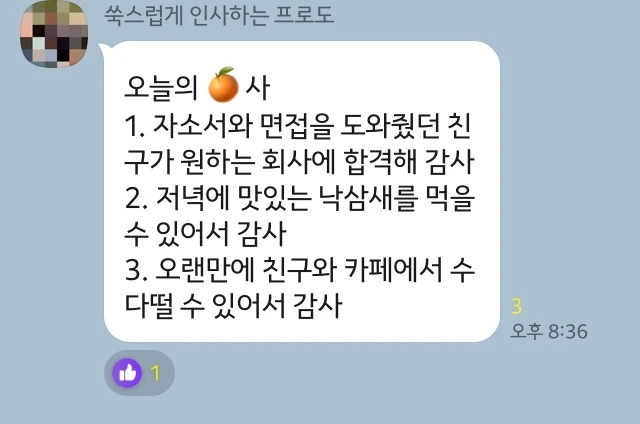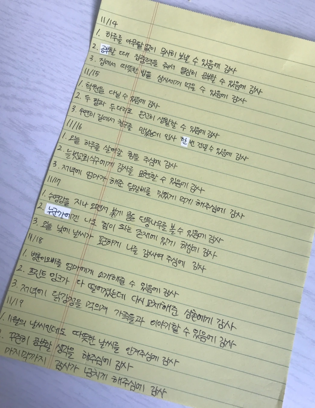 그 이야기들을 통해 우리 공동체는 감사의 에토스가 다시한번 짓게 묻어 났다. 그리고 누구도 시키지 않았는데, 감사절을 맞이하여 한주 내내 감사의 이야기를 노트에 기록하면서 한번더 감사를 표현하고 훈련한 지체의 이야기 역시 우리 공동체에 감사의 아름다운이야기에 짙은 향기를 더했다.