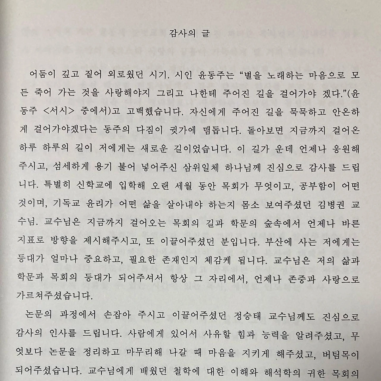 어둠이 깊고 짙어 외로웠던 시기. 시인 윤동주는 “별을 노래하는 마음으로 모든 죽어 가는 것을 사랑해야지 그리고 나한테 주어진 길을 걸어 가야 겠다.”(윤동주 <서시> 중에서)고 고백했습니다. 자신에게 주어진 길을 묵묵하고 안온하게 걸어가야겠다는 동주의 다짐이 귓가에 맴돕니다. 돌아보면 지금까지 걸어온 하루 하루의 길이 저에게는 새로운 길이었습니다. 이 길가 운데 언제나 응원해주시고, 섬세하게 용기 불어 넣어주신 삼위일체 하나님께 진심으로 감사를 드립니다. 특별히 신학교에 입학해 오랜 세월 동안 목회가 무엇이고, 공부함이 어떤 것이며, 기독교 윤리가 어떤 삶을 살아내야 하는지 몸소 보여주셨던 김병권 교수님. 교수님은 지금까지 걸어오는 목회의 길과 학문의 숲속에서 언제나 바른 지표로 방향을 제시해주시고, 또 이끌어주셨던 분입니다. 부산에 사는 저에게는 등대가 얼마나 중요하고, 필요한 존재인지 체감케 됩니다. 교수님은 저의 삶과 학문과 목회의 등대가 되어주셔서 항상 그 자리에서, 언제나 존중과 사랑으로 가르쳐주셨습니다.