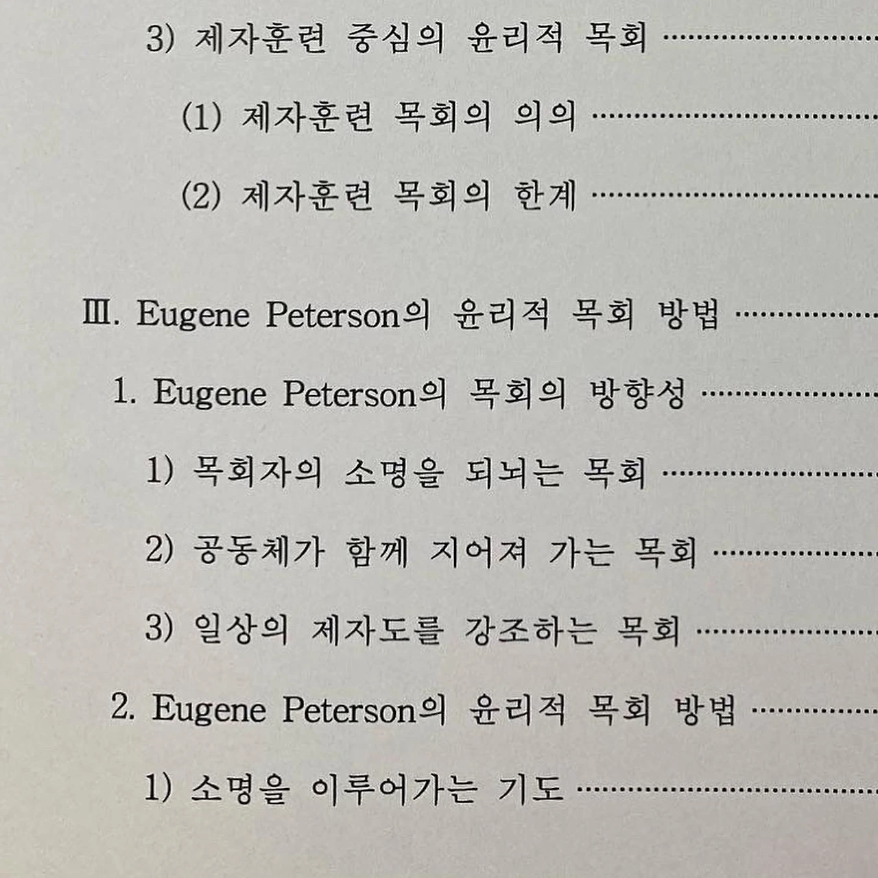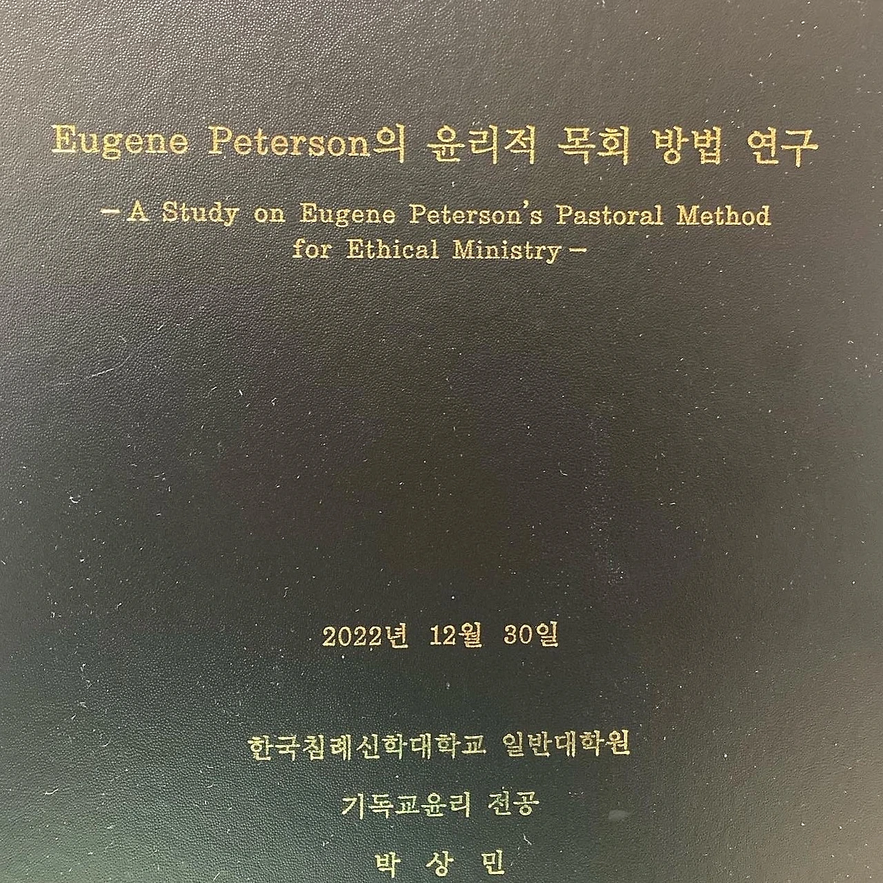 유진 피터슨 목사님. 저도 그런 목사가 되고 싶고, 그런 목회를 하고 싶습니다. 그러기 위해 아마도 저는 목회하는 내내 목사님께서 남기신 소중한 이야기들과 글들을 읽고, 또 그것들을 통해 넉넉하게 소화시켜 나갈 것 같습니다. 그런면에서 이번 이 논문은 저에게 있어서 목사님을 한번더 이해하고, 따라갈수 있게 해준 고마운 시간이었습니다.
