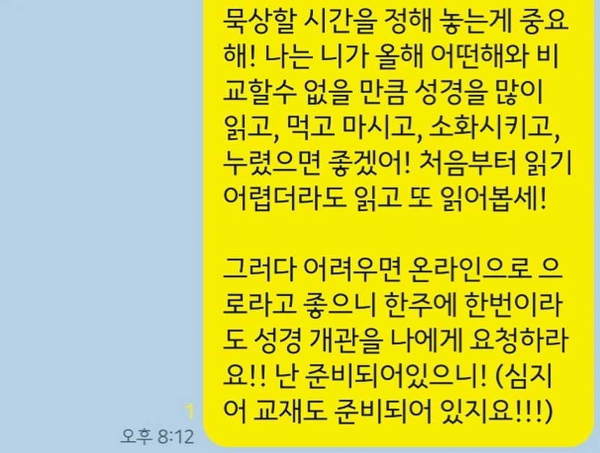 그러다 어려우면 온라인으로 으로라고 좋으니 한주에 한번이라도 성경 개관을 나에게 요청하라요!! 난 준비되어있으니! (심지어 교재도 준비되어 있지요!!!)”