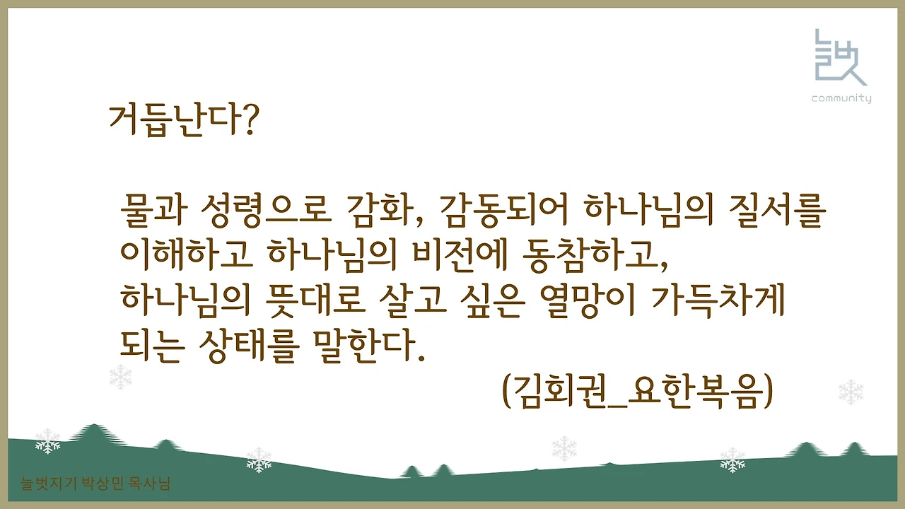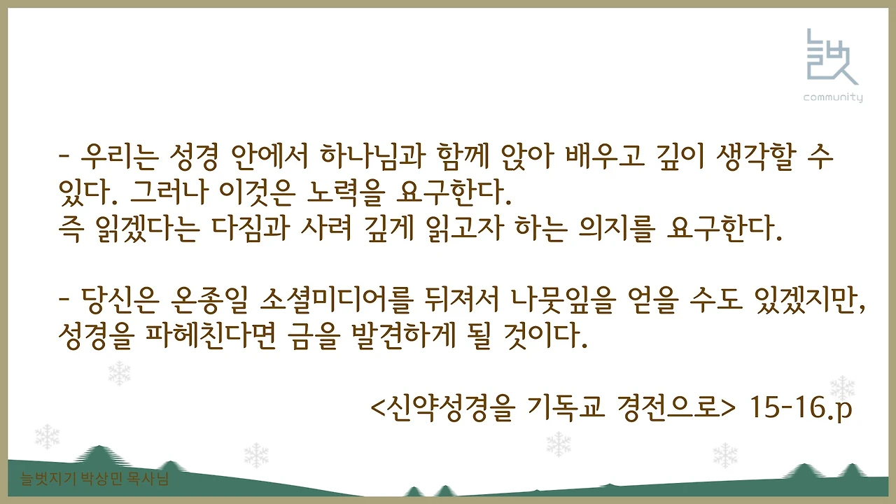 이렇게 바쁜이들에게 계속해서 2000년 전의 내용이 쓰여 있는 종교 경전을 읽으라고, 읽어야 산다고, 읽어야 살아갈 힘을 얻는다고 강조 하는 이유가 있다.