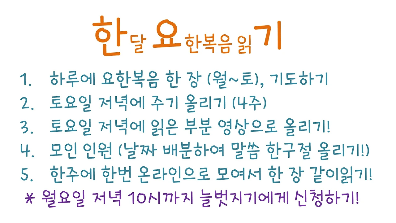 그래서 우리 늘벗교회는 이번 한달간 생명과 사랑의 책. 요한복음을 하루에 한장씩읽고 서로 독려하고, 읽은 것을 살아가고 또 실패한 이야기를 주에 한번씩 나눌 생각이다.
