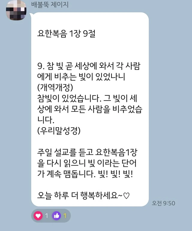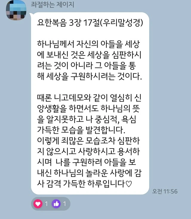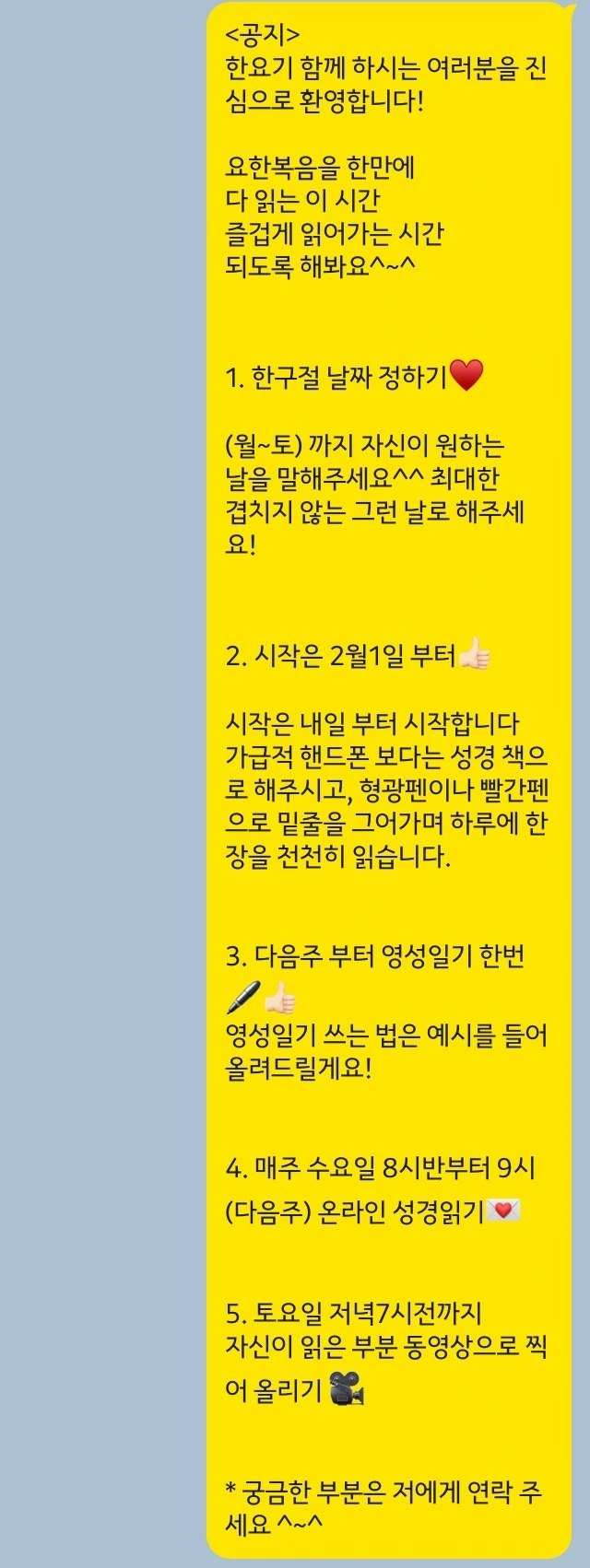 20대.30대.40대.50대가 모였다. 목회자 성도 집사님 청년 가리지 않고 맡은 요일을 정해서 와닿은 부분을 하루 한번 나눈다. 그리고 리액션! (이모티콘 대환영)