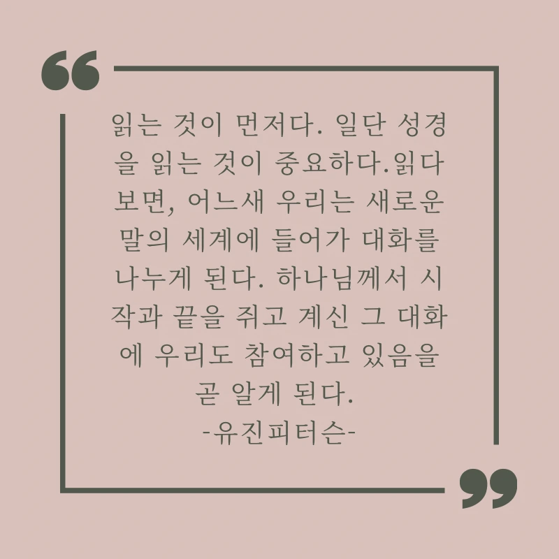“읽는 것이 먼저다. 일단 성경을 읽는 것이 중요하다.읽다 보면, 어느새 우리는 새로운 말의 세계에 들어가 대화를 나누게 된다. 하나님께서 시작과 끝을 쥐고 계신 그 대화에 우리도 참여하고 있음을 곧 알게 된다. ”