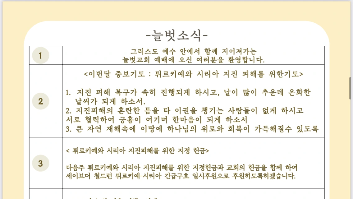 우리는 그것을 실천하고 이루어 가기위해 다음주 늘벗교회는 튀르키예와 시리아 지진 피해를 위해 작정헌금을 모아 나누도록 하겠습니다.