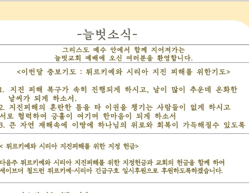 그렇게 한주간 우리 늘벗교회는 82만원이라는 마음을 모였다. 이 금액이 누군가에게 어떻게 느껴질지 모르겠지만, 우리 교회에는 과부의 두렙돈과 같은 금액이다. 헌금의 액수가 아닌 과부의 마음의 중심을 보시며 칭찬한 주님. 우리의 마음과 힘과 뜻이 아닌 전적으로 하나님의 은혜를 받았기에 전부를 나아갈 수밖에 없던 과부의 모습을 칭찬하신 것처럼 주님은 늘벗교회를 칭찬하고 있으리라 생각한다.