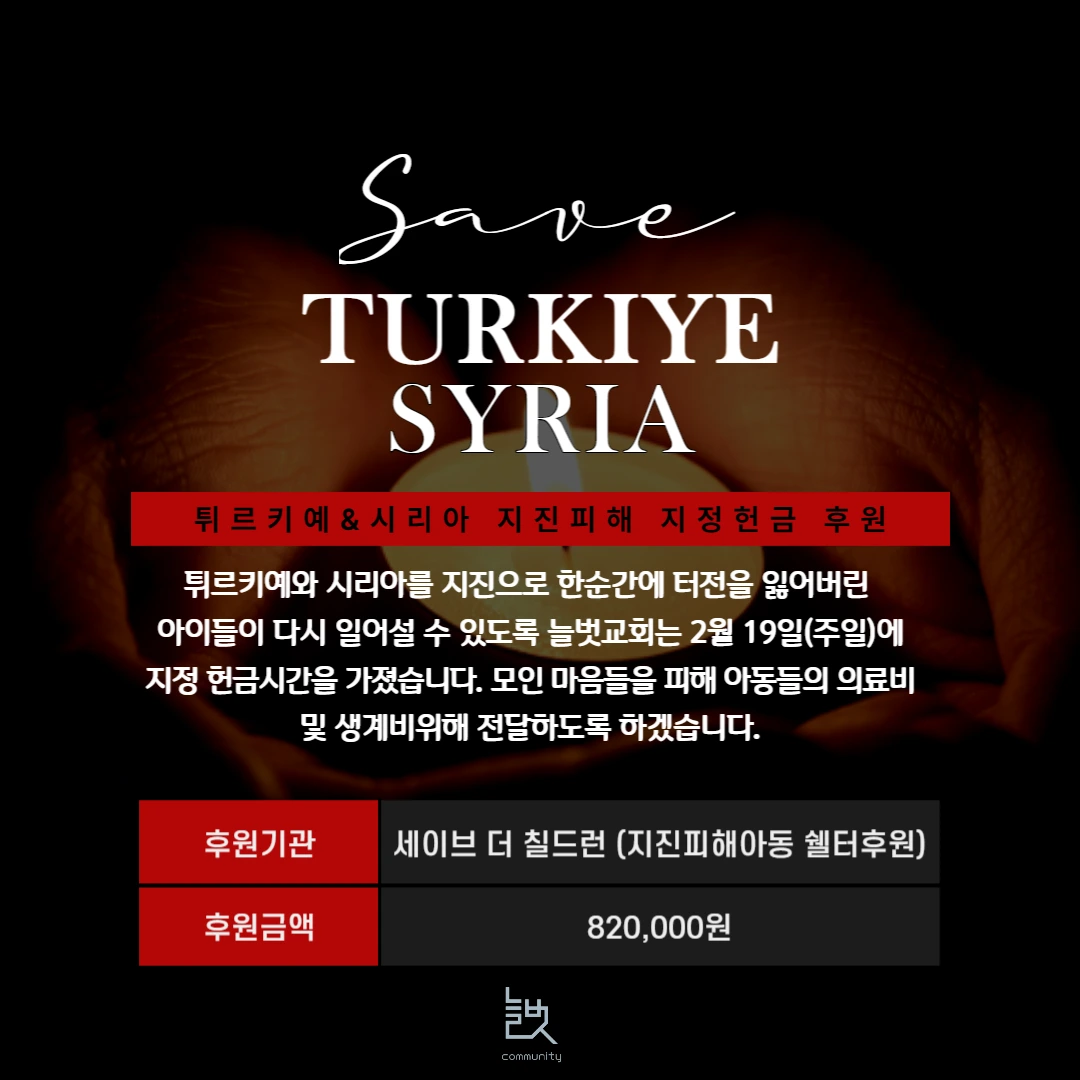 기도 가운데 우리 공동체가 계속해서 마음에 두는 존재들이 눈에 들어왔다. 바로 다음세대. 부모를 잃은 어린 아이들. 그들에게 지금 당장 살아갈수 있게 해주는 무언가를 돕고 싶었다. 유튜브 알고리즘은 나를 다양한 구호단체로 초대해 줬고, 하나님께서는 세이브더 칠드런에 마음을 두게 하셨다. 그래서 성도들과 함께 우리는 튀르키에 – 시리아 지진 피해자들 가운데 “세이브더 칠드런을 통해 아이들을 돕겠습니다! 따라서 다음주는 특별히 지진 피해자들을 위한 지정 헌금을 부탁드리겠습니다”라고 광고 했다.