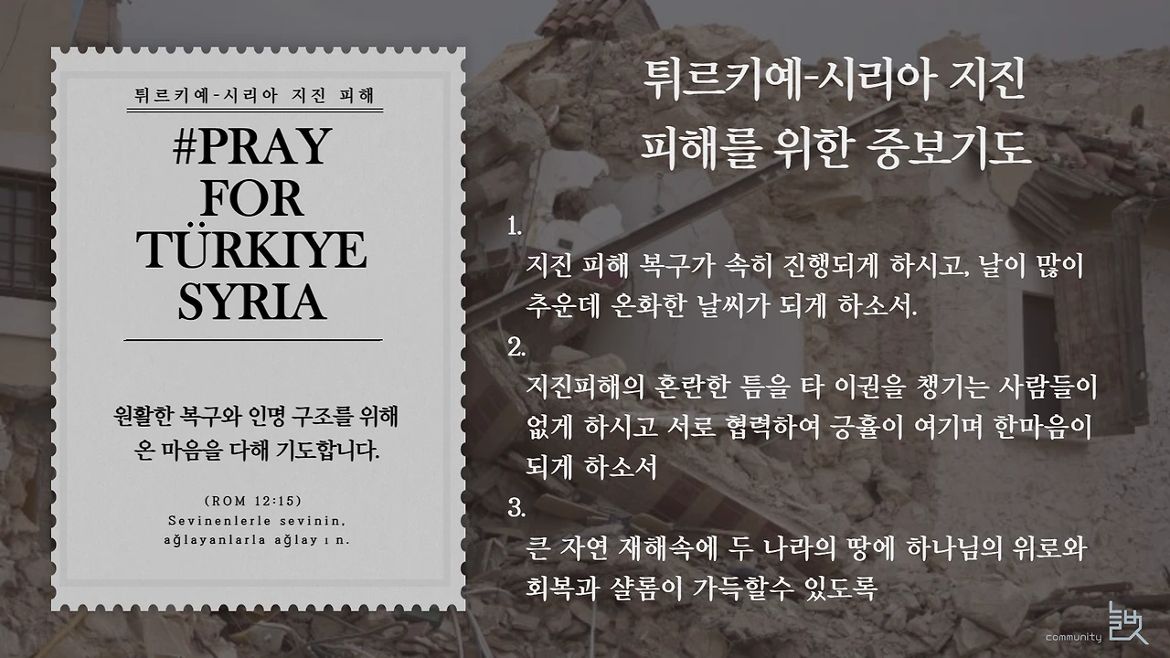 작지만, 홀로 존재하기 버겁지만, 아직도 비틀거리고, 넘어지지만 마음을 모았다. 튀르키예와 시리아 지진의 피해자들을 바라보며 함께 울기 시작했다. 가장 먼저는 함께 마음을 다해 기도하기 시작했다. 예배 가운데 중보기도 시간을 마련해서, 고통과 어려움속에 있는 사람들의 마음을 같이 느낄수 있도록 성령님께 간구했다. 그리고 계속 상상했다. 그들가운데 누구를, 어떤 방법으로 도울 것인가?