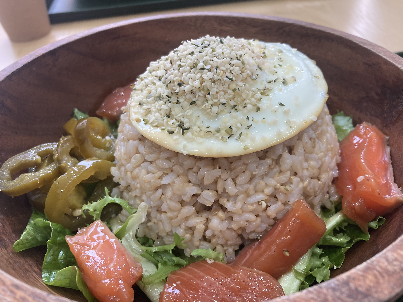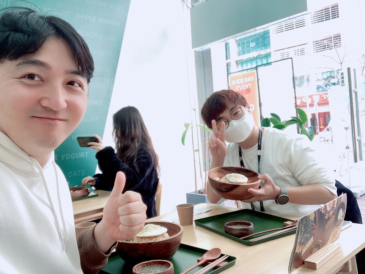 오늘은 취직 기념으로 점심에 찾아가 함께 연어 덮밥을 먹었다. 어느새 직장인이 되어 밥을 다 사준다.