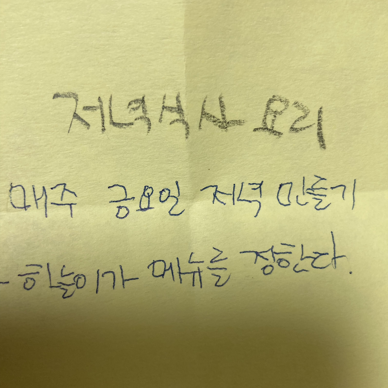 가장 먼저는 엄마의 안건인 <저녁식사요리>에 관한 내용이었다.
