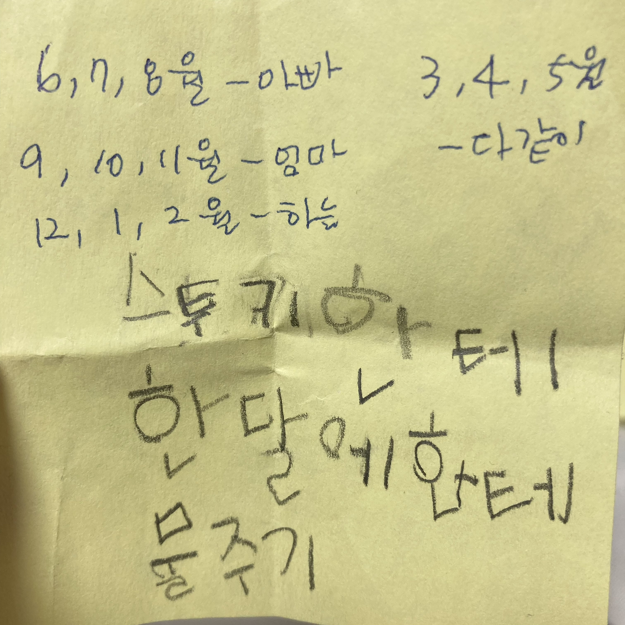 - 현재 모든 식물관리를 아빠 혼자 하는데 우리 가족이 나눠서 했으면 좋겠다고 했다. 하늘이는 각자의 생일이 있는 달을 이야기 하며,