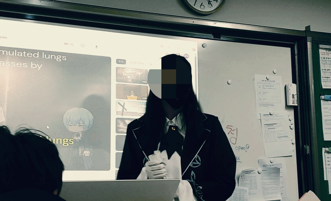마지막 발표는 영어였고 담임선생님 수업이었다. 발표자료를 ppt로 만들던 중, 아이는 순간 자신이 좋아하는 게임 캐릭터를 활용하고 싶다는 생각을 했다. 선생님께 발표자료에 캐릭터를 써도 된다는 허락을 받고는, 곧이어 캐릭터 의상을 착용해도 괜찮다는 허가까지 받았다. 아이는 마지막 발표를 재미나게 하고 싶었다고 한다. 일련의 일들로 아이를 기억하는 동급생들과 선생님들은 꽤 기대를 했나 보다. 발표하던 날, 의상을 갈아입고 교단에 선 아이를 선생님은 직접 사진을 찍어서 보내주셨다. 마침 수업이 없던 음악선생님이 아이의 발표가 궁금해서 구경을 오셨다. 반 친구들 뿐 아니라, 다른 반 아이들까지 몰려와서 발표를 하기 전 함께 기념사진을 찍기도 했다.