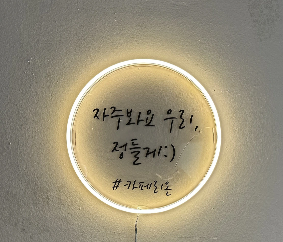병원에 정기검진을 갔던 날, 늘 가던 카페가 공사를 해서 새로운 카페를 찾아야 했다. 그리고 발견한 벽의 무드등에는 '자주 봐요 우리, 정들게'라고 씌어 있었다. 그 문구를 한동안 바라보다가 결심을 했다. 그리고 상하이에서 온 언니에게 톡을 보냈다. '언니, 우리 O월 O일 분당에서 만날까요? 자주 봐요, 정들게.' 하고. 믿을 수 없겠지만, 그건 내 생에 있어 첫 번째 혼자만의 일탈이었다. 한 번도 나만의 시간을 보내기 위해서 다른 지역에 가본 경험이 없었다. 늘 부모님이나 남편, 또는 아이들이 있었다. 나 스스로도 놀라운 결정이었지만, 그 당일여행은 너무나 자유롭고, 즐거웠다. 물론 아이들도 엄마 없는 하루를 아주 잘 보냈다. 그날은 우리 가족에게 새로운 생활을 열어준 날이 되었다. 그 후로는 종종 "엄마 쉼이 필요해." 하며 당일이나, 1-2박의 짧은 여행을 하곤 한다. 누군가를 만나기도 하고, 오롯이 혼자 보내기도 한다. 내가 나를 보살피는 시간이 정말 필요했었다는 것을 함께해서 좋은 이들을 만나고서야 알게 되었다.