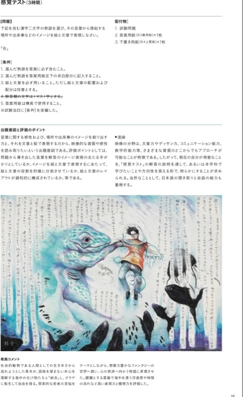 영상학과의 '감각테스트'라는 이름의 시험이다. 문제는 한자 하나나 둘을 주제어로 제시하는데, 이것으로 숙어를 만들어서 뒷면에 쓰고, 앞면에는 글과 그림을 배치하는 시험이다. 시험시간은 3시간 주어진다. 정답은 없지만, 합격작을 보니 써야 하는 글도 2000자 이내라 적지 않고, 그림까지 그려내려면 만만치 않은 작업이다. 더욱이 아이의 일어실력은 검증받은 적이 없는 상태였다. 그러나 아이는 상담실을 나서자마자 말했다