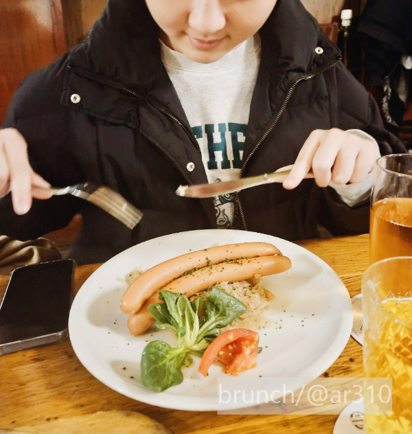 메뉴판을 독서하듯 들여다보며 무슨 메뉴를 시켜야 좋을지 고민했다. 독일 메뉴판은 이상하게 사진이 없었다. 우리가 더듬더듬 메뉴판을 읽는 모습을 보고 웨이터리스가 다가와 주문을 도와주었다. 프랑크푸르트 전통 소시지와 독일식 피자, 사과주스, 아펠바인을 주문했다. 옆 테이블의 으깬 감자 위 소시지가 무척 맛있어 보였지만 차마 ‘저거랑 똑같은 거 주세요.’라고 말하지 못했다.