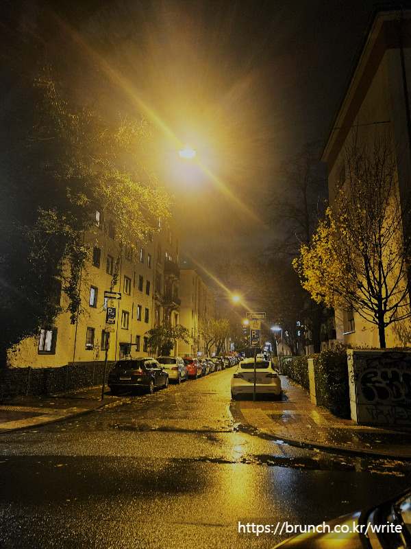잠시 걸음을 멈추고, 프랑크푸르트의 밤 골목을 바라보았다. 조금 전 비가 내렸던지, 골목 곳곳에 떨어진 낙엽들이 가로등 불빛 아래서 촉촉하게 반짝였다.