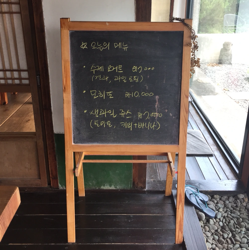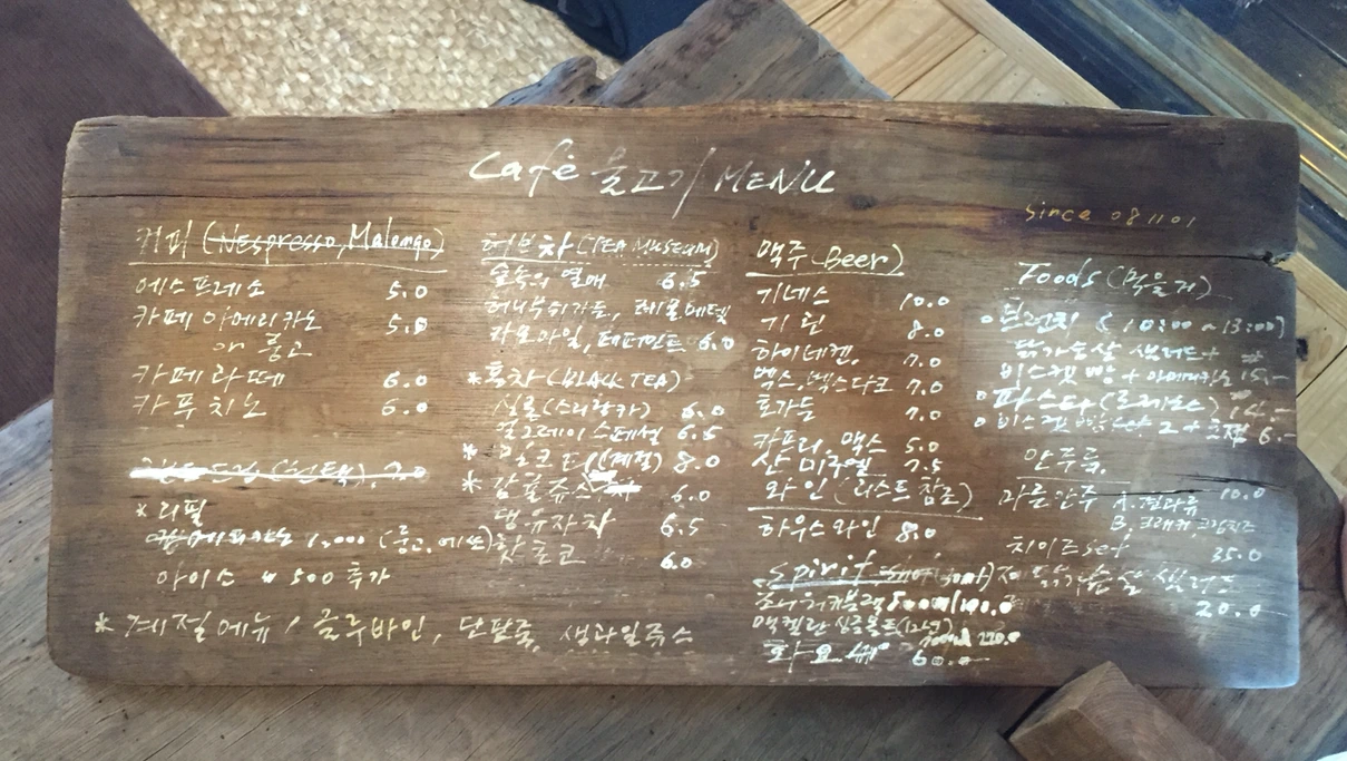 아마도 집을 고쳐지으며 발견했을 나무판에 대충 쓴 듯 적은 메뉴들도 한껏 멋스럽다. 커피 말고도 브런치며, 맥주와 안주 등 메뉴는 그런대로 다양한 편이다. 여름엔 참 이상하게 모히또가 땡기는데 오늘의 메뉴가 있는지 주문 후에 알았네.