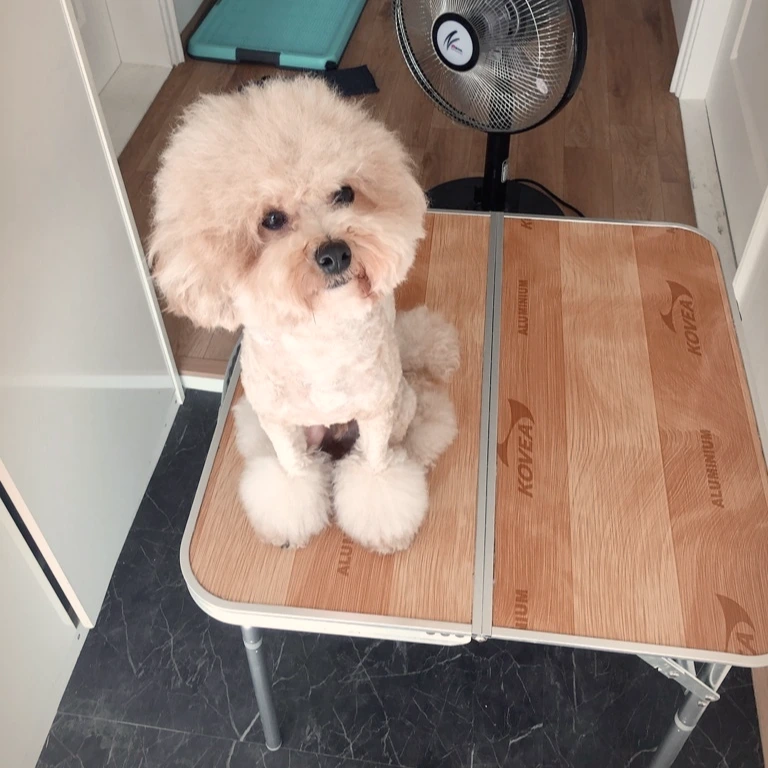 다른 집에 피해를 주지 않으려고 복도 대신 현관에서 하기로 하고 현관 방충망을 쳤다. 털이 방안에 날리지 않도록 선풍기 바람을 현관 쪽으로 쐬어 털을 날리고 캠핑 테이블 높이를 높여 간이 미용테이블을 만들었다. 빈이는 목욕시킨 후에 빗으로 털을 곱게 빗어주고, 충전해둔 미용기와 미용가위를 준비하면 끝!