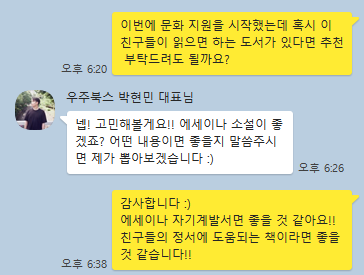 도서 비용의 일부를 우주북스에서 지원하겠다는 내용과, 저자 토크 및 강연 기획까지 제안해주셨다.