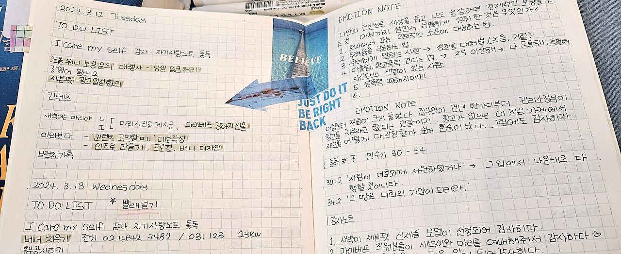 준비를 마치면 차로 10분 거리 카페에 출근하면 오픈 준비를 하고 테이블에 앉는다. 노트를 펴고 그날의 TO DO LIST와 일기를 쓴다. 조금 더 여유가 되는 날에는 책을 읽고 그중 마음에 닿는 구절을 노트에 옮겨 적고 감사일기도 쓴다. 손님이 오시면 메뉴를 나가고, 빈 시간에는 유튜브 영상을 편집한다.