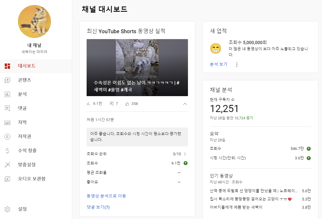 억울했다. 새벽이는 마리야 채널은 아직 수익창출이 발생하지 않으며, 숏츠 수익은 조회수 1당 0.16원이기 때문에 수익창출을 한다고 해도, 1만 뷰 영상의 수익은 1,600원 정도로 크지 않기 때문이었다. 원하는 성과에 도달하고 있음에도 기대했던 만족이 찾아오지 않는다는 사실에 좌절감이 들었다.