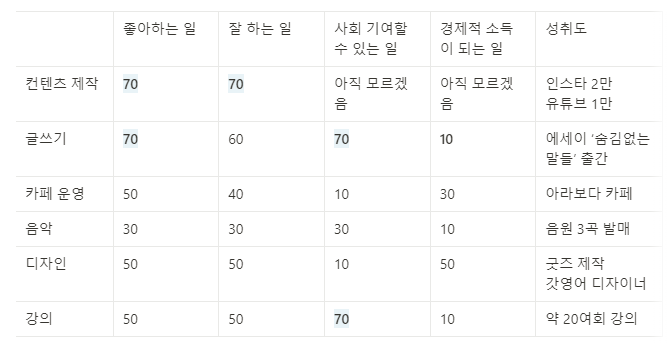 좋아하는 일과 잘하는 일을 찾아 성과를 만들면 사회에 기여하기 어려운 일이거나 경제적인 보상이 따라오지 않고, 사회에 기여할 수 있는 일들에 집중하면 내가 원하는 일들을 할 수 없었다.