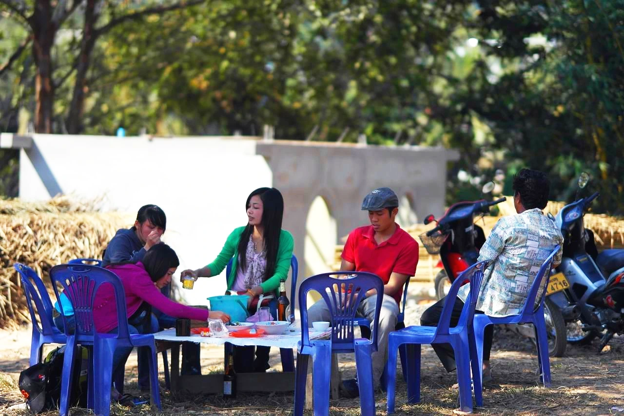 옹기종기 모여 새참을 준비한다. 당연하다는 듯이 딱 3초 동안만 일했던 나도 껴준다. 우선 시원하게 얼음을 재운 비어라오 한 잔을 건네받았다. 꿀떡꿀떡 잘 넘어갔다. 무서운 강변길과 사투를 벌이느냐 목이 탔기 때문이다. 쫘악 들이키고 잔을 비우니 또 채워준다. 얼음 탄 비어라오는 황홀경.