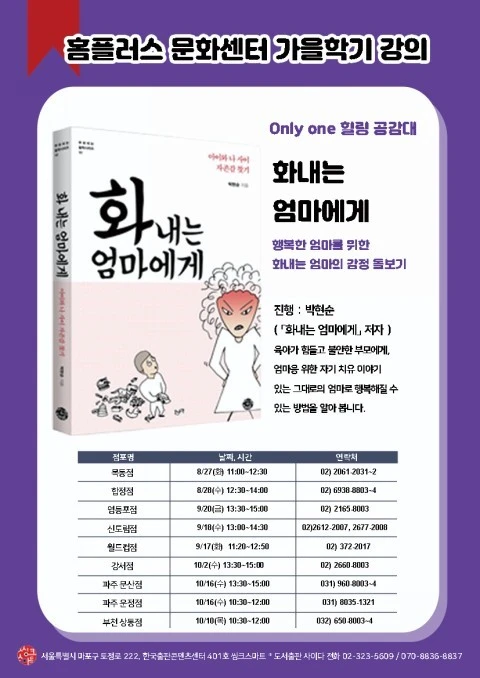 2018년 여름, <화내는 엄마에게> 책이 나왔다. 출판사와 계약을 하고 정확히 1년만에 만난 나의 첫 책이다. 감격도 잠시, 이 책을 널리 알려야 한다는 현실이 다가왔다. 무명작가의 책을 사람들이 클릭하여 결제를 하고, 읽어 주시기를 마음만으로 빌 수는 없었다. 그럴 때에 한 문화센터에서 연락이 왔고, 신기하고 감사한 마음으로 열군데 가까이 저자 강의를 진행했다.
