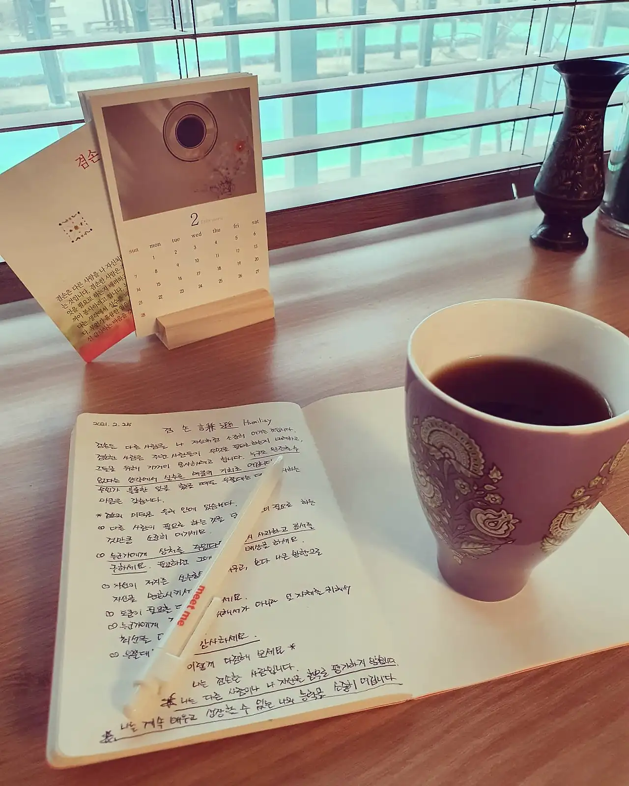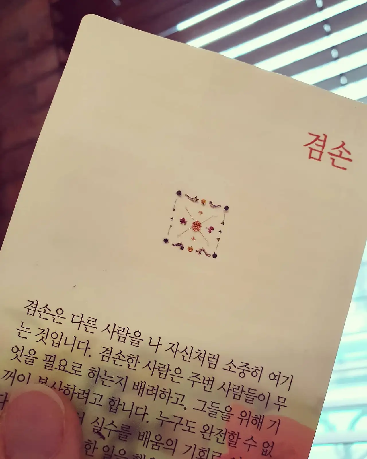 오늘은 저의 몸맘 배터리 충전하는 날이에요. 밑미 버츄감사 리츄얼 인증이자 저와의 약속을 위해 겸손 버츄카드를 필사하며 따듯한 차도 한 잔 준비했어요. 저 필사 3년 차인데, 오늘 겸손 카드의 힘이 확 들어왔어요~~ '겸손은 다른 사람을 나 자신처럼 소중히 여기는 것입니다.' '누구도 완전할 수 없다는 생각에서 실수를 배움의 기회로 여깁니다.' '누군가에게 상처를 주었다면, 즉시 사과하고 용서를 구하세요.' ' 나는 다른 사람이나 나 자신을 함부로 판단하지 않습니다.' '나는 계속 배우고 성장할 수 있는 나의 능력을 소중히 여깁니다.'