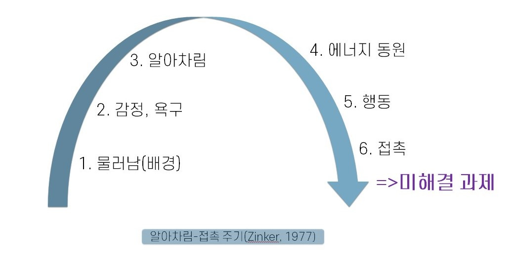마음은 늘 변하고, 왔다 갔다 하고, 그거 안다고 돈 되는 것도 아닌데 왜 자꾸 알아차리라고 하는 건지 의문이 드시나요? 이제 그 의문에 대한 답을 알려드릴게요. 이해를 돕기 위해서 아래의 이미지로 정리해 봤어요. 게슈탈트 심리학자인 Zinker의 알아차림-접촉 주기(Zinker. J, 1977)로 6단계로 나누어 설명할 수 있어요.