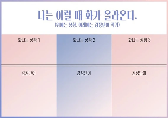 화가 나는 상황을 적은 것 중에 가장 힘들게 만드는 세 가지를 골라서 적어 보세요. 그 상황에서 어떤 감정들을 느끼는지 위의 감정단어 목록에서 찾아서 적어 보세요.