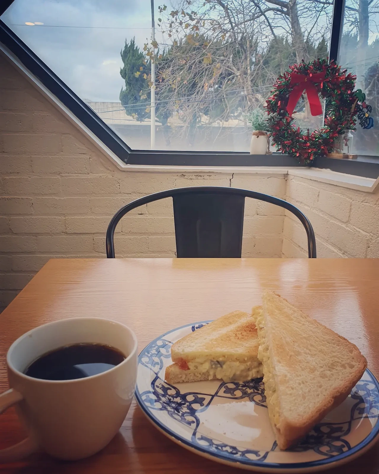 게스트하우스의 또 다른 매력은 조식이잖아요~ 딸은 여전히 나가지 않겠다고 해서 저 혼자 먼저 준비하고, 부엌으로 올라갔어요. 조식 먹을 때는 사람들이 많지 않았어요. 토스트 샌드위치와 따끈한 커피, 간단하지만, 이 식탁 위의 풍경도 그리웠어요. 창밖을 보며 홀로의 여유를 맘껏 누렸답니다.