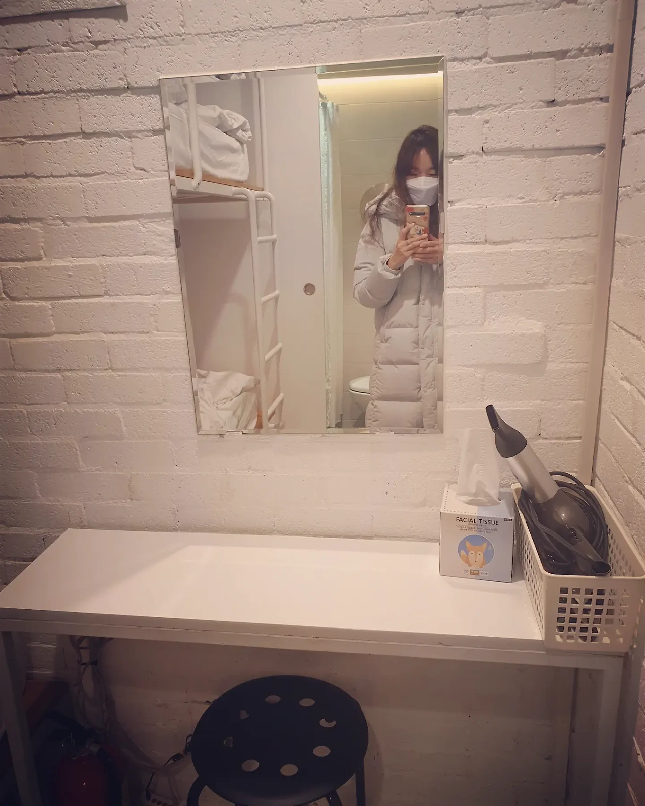 첫째 날은 제주에서만 가능할 것 같은 아늑하고 아담하고 평온한 우리만의 숙소였다면, 둘째 날 게스트하우스는 옹기종기 모여서 사람의 숨결이 공기에서 전해지는 곳이었어요. 입구부터 다섯 사람만 서 있어도 꽉 들어차는 것 같고, 배정받은 방은 더 했죠. 아이와 묵을 수 있는 2인실이었는데, 단독 화장실이 있고, 이층 침대와 화장대 앞에 앉을 수 있는 공간이 다였어요. 게스트하우스에서 이 정도면 만족이다 싶었는데, 저만 그렇다는 것이 문제였죠. 첫째 날 널찍하다 못해 우리 둘이 있어서, 무섭다고 느꼈는데 비교체험도 아니고 다음 날 바로 침대 위에만 몸을 뉘어야 하는 곳이니 충격적이었나 봐요. 딸에게는 생애 첫 게스트하우스였으니까요.