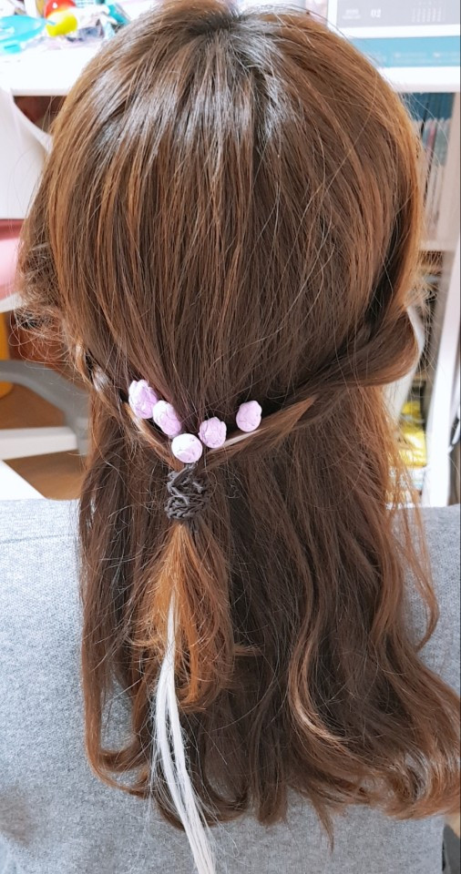 이때까지만 해도 양호하죠. 둘째 딸이 저를 위해 보라색 꽃삔 5개를 만들고, 제 머리를 멋지게 만들어줬어요. 다 0소 가서 야심 차게 사온 하얀색 헤어피스도 붙여주고, 만화에서 본 아이돌 언니들처럼 머리라도 만들어보고 싶은 거죠. 왜 저희도 어릴 때 이럴 때 있잖아요. 머리 긴 사람들만 보면 어떻게 해 보고 싶은... 제 머리가 길다 보니, 딸에게 기쁜 마음으로 내어줬습니다.