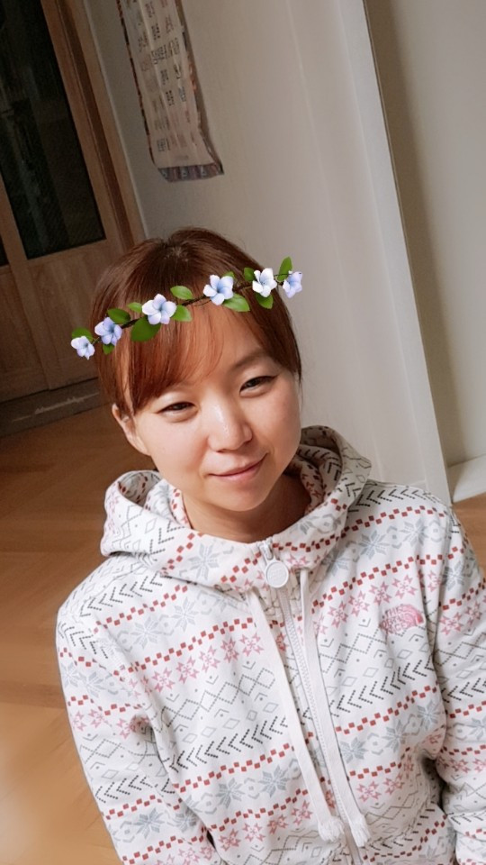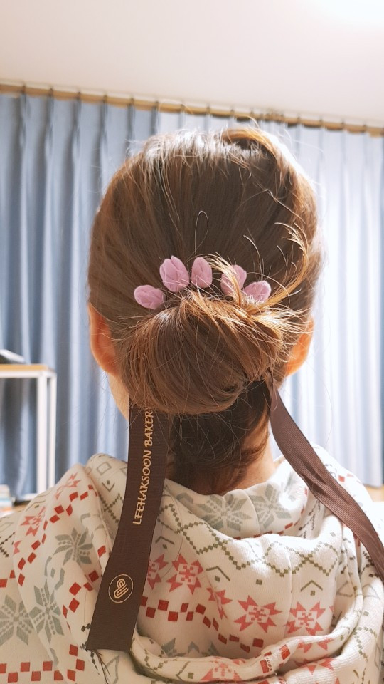 다음 날 저녁이 되자, 둘째가 이번에도 앉아보라고 하네요. 빵 포장용 리본을 가져와서 보라색 꽃삔과 함께 예쁘게 만들어 줬어요. 앞모습도 예쁘게 찍어준다며 꽃 화관 스티커도 해 주네요. 저는 사진 찍으면 얼어붙는 사람인데 참... 요즘 사진 많이 찍힙니다. 아이들과 오래오래 있으니 맞춰줘야지요.
