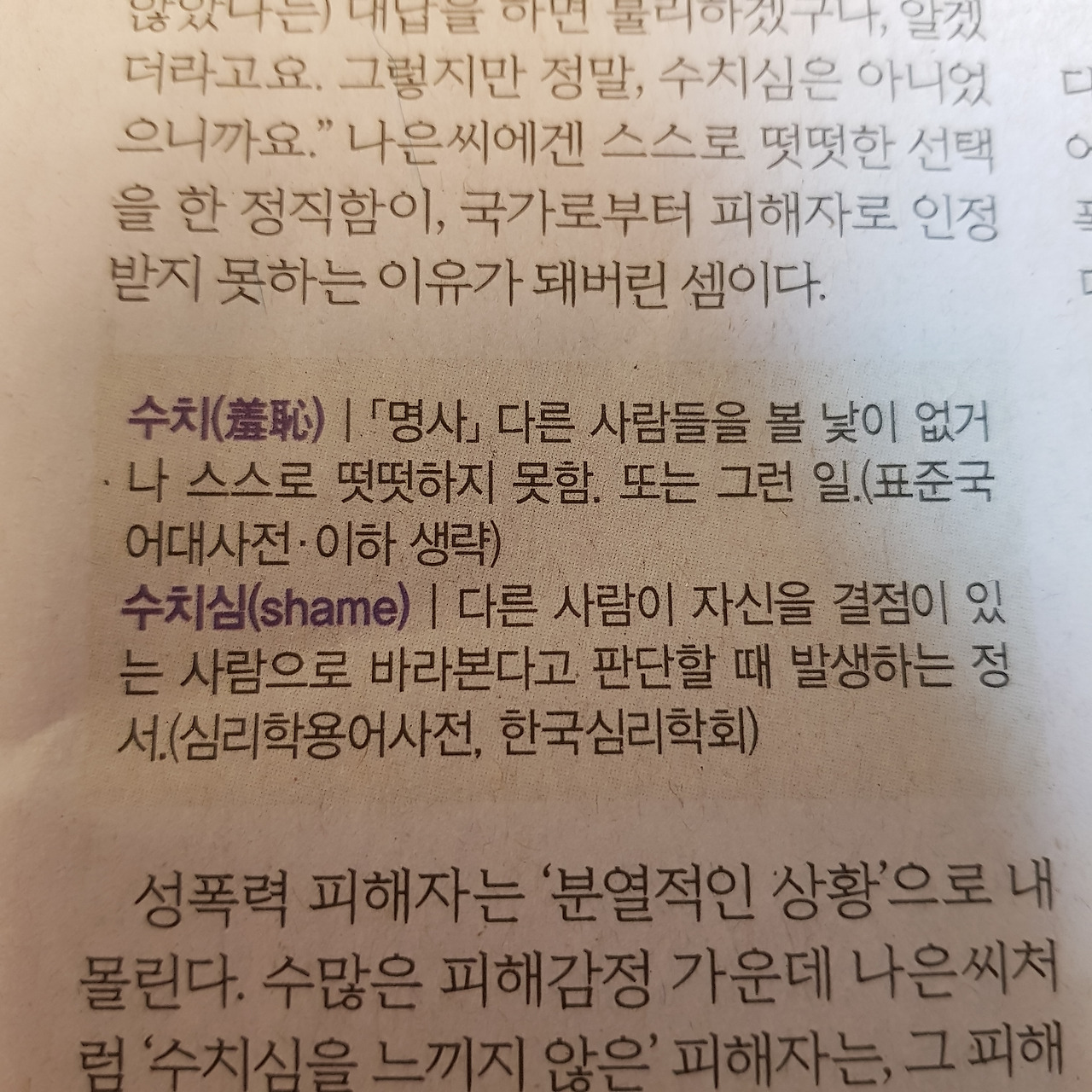 첫 장부터 저의 이목을 끄는 기사가 대문짝만 하게 실려있네요. 남녀를 불문하고, 성폭력 피해자들에게 부끄러움을 강요하는 '성적 수치심'을 묻지 말고, 다른 말로 대체하여 '성적 불편감' 등의 표현을 제시하는 기사였어요. 성폭력 피해자들이 사건 수사를 할 때, 가장 중요하게 묻는 사항이 '성적 수치심'을 느꼈냐는 말이래요. '수치심'의 심리학 용어사전 뜻은 '다른 사람이 자신을 결점이 있는 사람으로 바라본다고 판단할 때 발생하는 정서'예요. 분명 피해를 당한 당사자인데도 자신을 어떻게 볼지에 대해 두려워해야 한다는 것이죠. 대법원 판결문에는 '일반인에게 성적 수치심이나 혐오감을 일으키고 선량한 성적 도덕관념에 반하는 행위인 것만으로는 부족하고 그 행위의 상대방인 피해자의 성적 자기 결정의 자유를 침해하는 것'(2011도 8805)이라고 되어 있어요. 피해자분들 중에서 '불쾌함, 분하고, 더럽고, 황당하고, 고통스럽고, 경악스럽고, 토할 것 같고, 속상하고, 비참하고, 괘씸하고, 두렵고, 불안하고, 무기력하고, 배신감, 모욕감, 굴욕감'이 뒤엉킨' 복잡한 감정임에도 '성적 수치심'이 처벌의 큰 척도로 판단되고, 사회가 이를 강요하고 있다는 의견이 실렸어요.