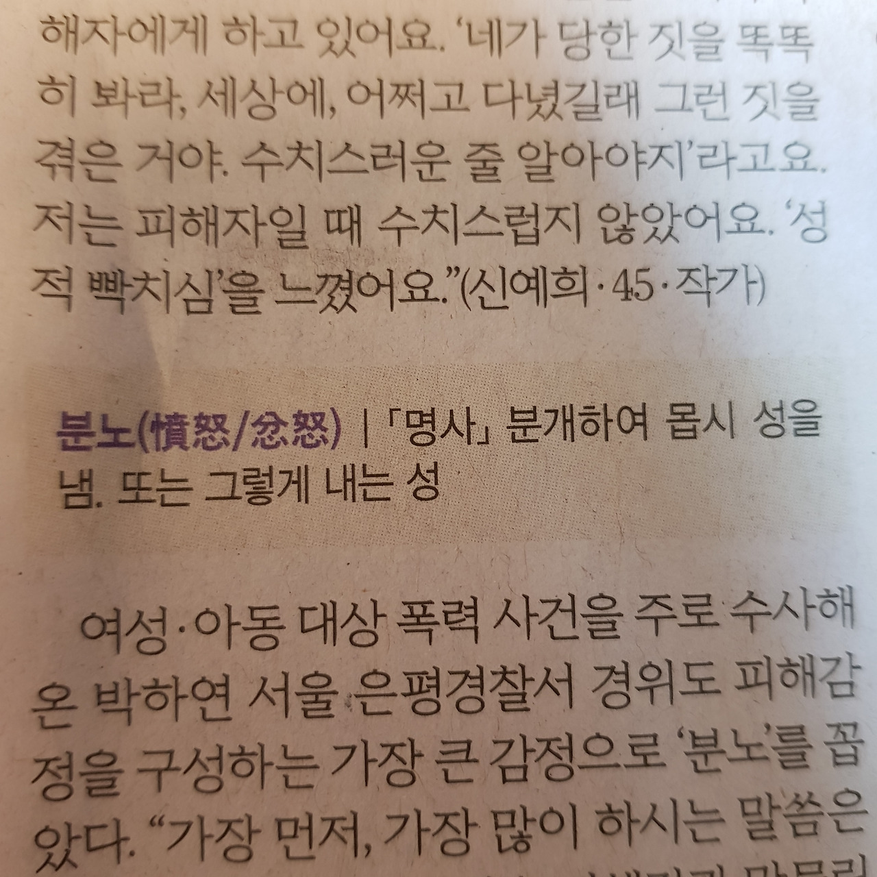제가 이 기사를 읽고 기록하고 싶었던 이유는 모든 감정을 존중하는 태도였어요. 누군가는 성적 불편감으로 분노, 불편, 두려움을 느끼고, 당연히또 누군가는 수치심을 느낄 수도 있어요. 수치심 역시 느껴서는 안 되는 감정으로 치부하면 안 되죠. 천 명의 피해자가 있으면 천 개 이상의 피해감정이 있다는, 너무도 당연한 이야기에 울컥했어요. 저 역시 크고 작은 성폭력의 피해의 경험에서 공감되는 말이었나 봐요.