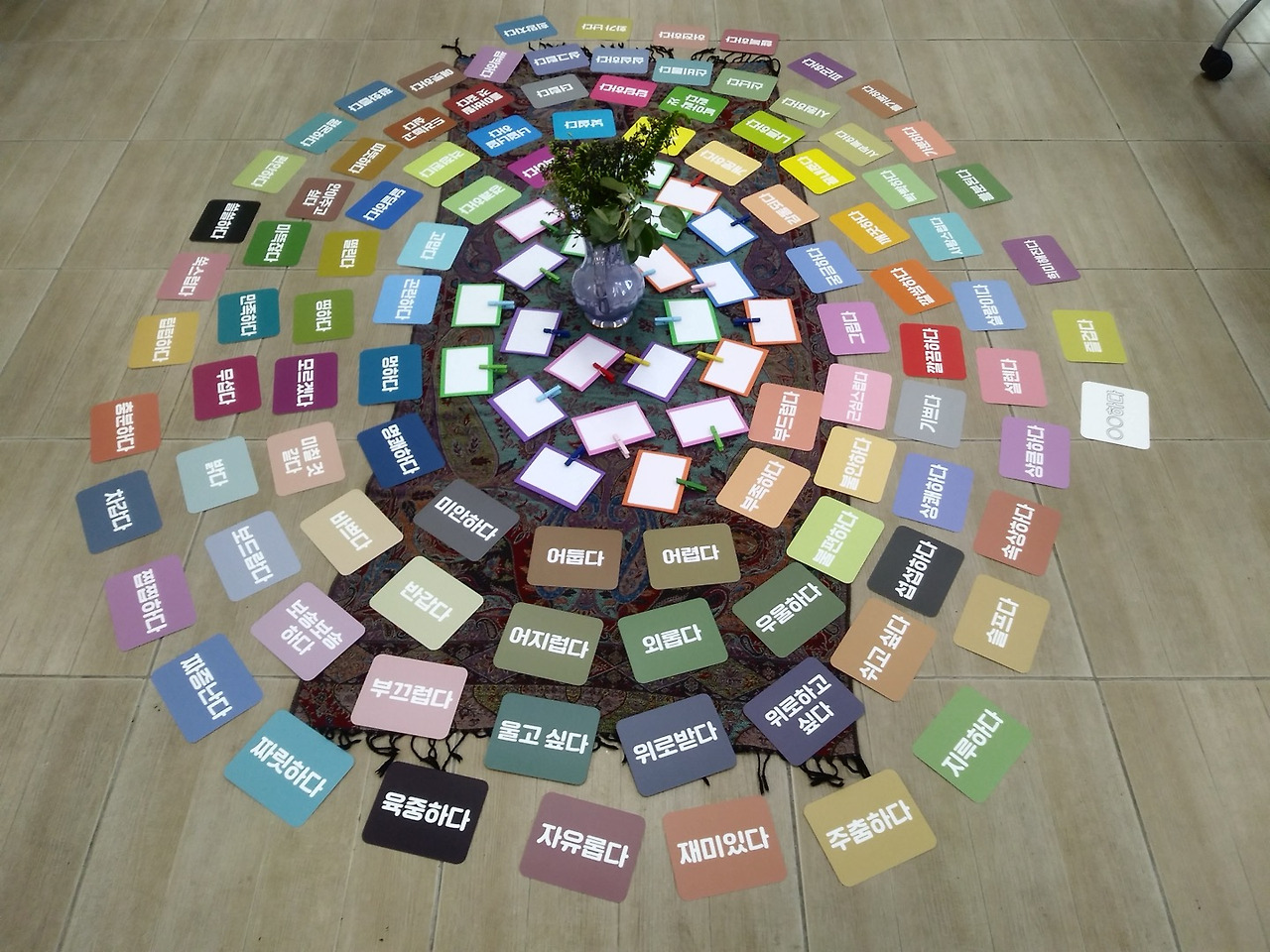 강의장에 둥글게 의자를 세팅해 놓고 느낌카드를 펼쳐 놓고 참여자들을 기다리고 있었다.