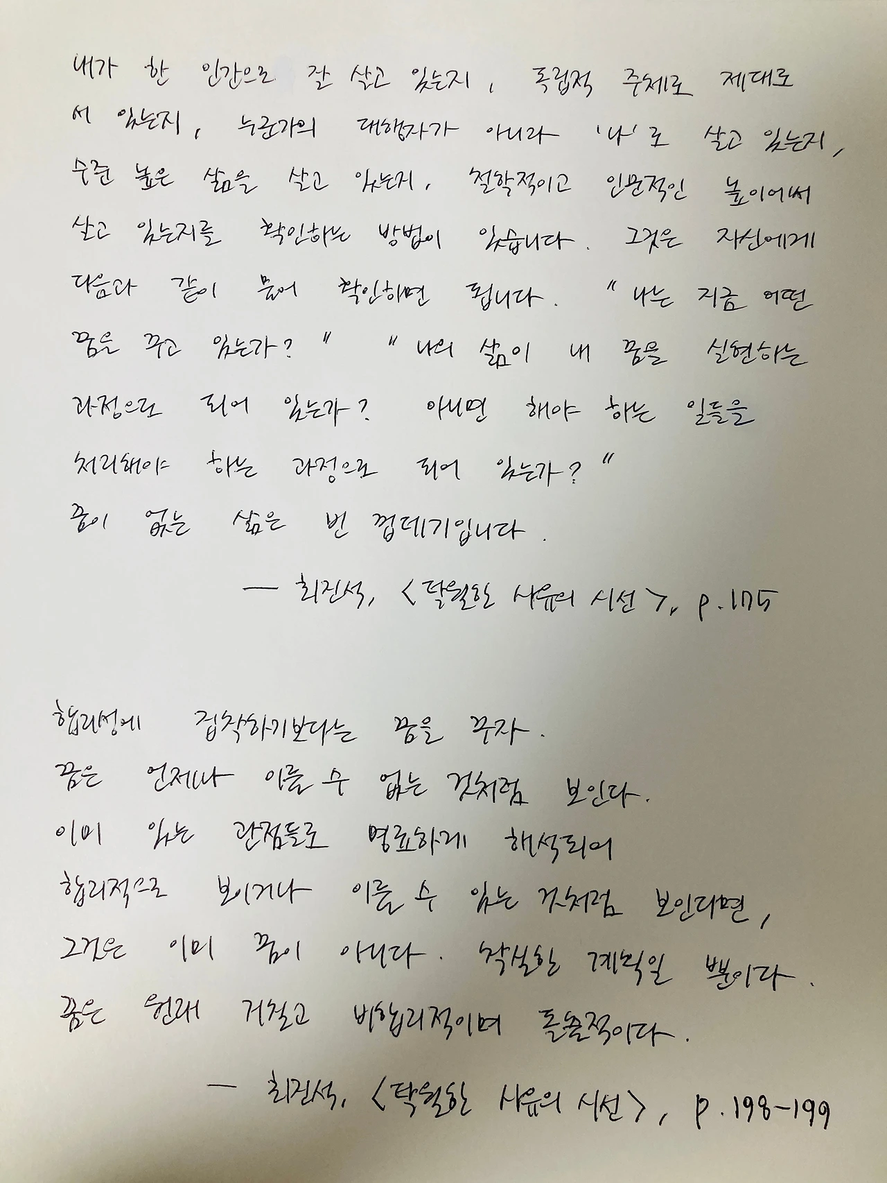 내가 한 인간으로 잘 살고 있는지, 독립적 주체로 제대로 서 있는지, 누군가의 대행자가 아니라 '나'로 살고 있는지, 수준 높은 삶을 살고 있는지, 철학적이고 인문적인 높이에서 살고 있는지를 확인하는 방법이 있습니다. 그것은 자신에게 다음과 같이 물어 확인하면 됩니다. "나는 지금 어떤 꿈을 꾸고 있는가?" "나의 삶이 내 꿈을 실현하는 과정으로 되어 있는가? 아니면 해야 하는 일들을 처리해야 하는 과정으로 되어 있는가?"