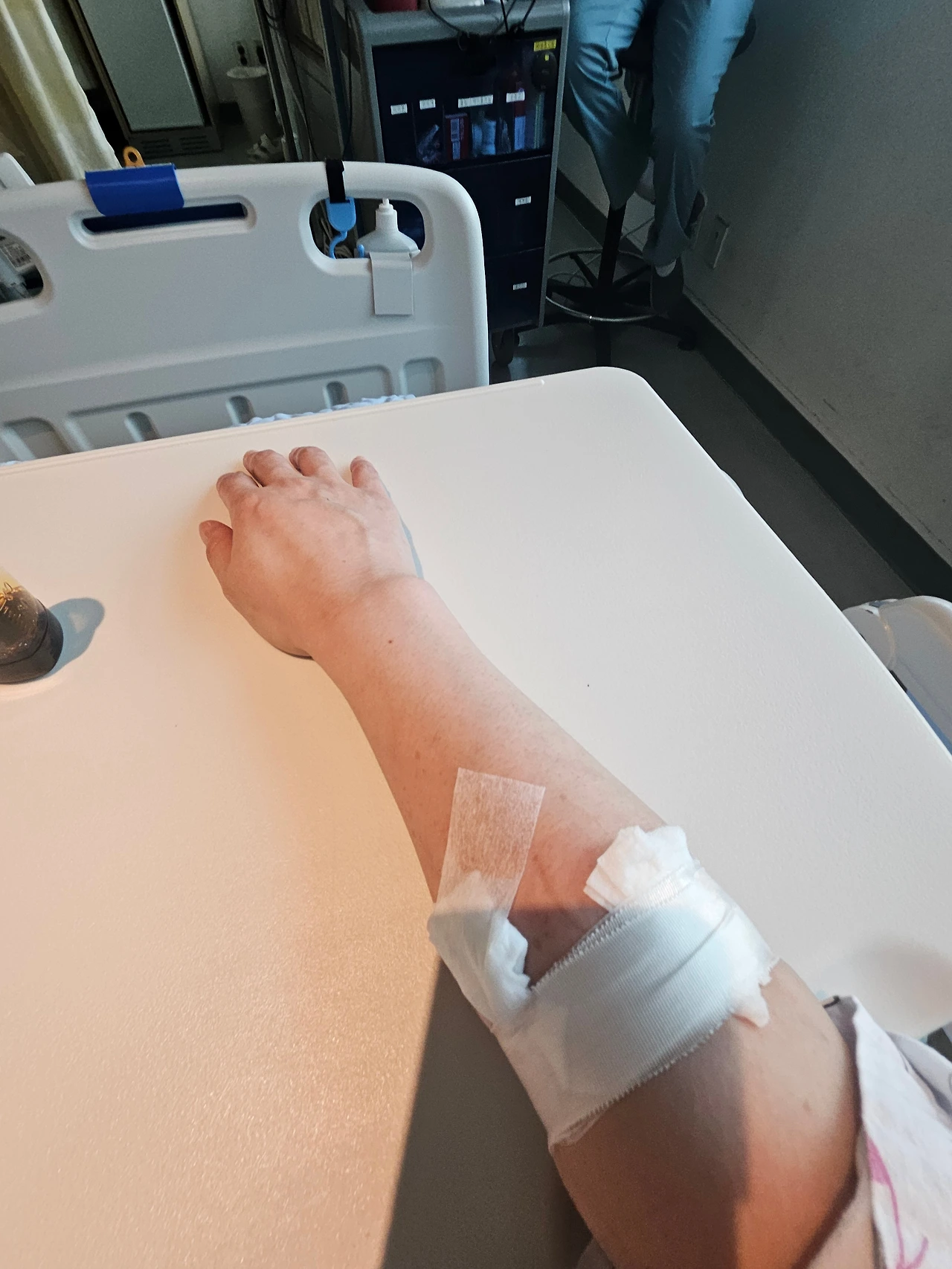 머리를 감은 후에 mri 조영제를 투여하기 위해 혈관을 잡았다. 왼쪽은 지난번처럼 실패, 오른쪽도 간호사는 포기하고 주사전문 간호사님도 팔은 포기하고 (많이 아팠..) 결국 손등에 겨우 잡았다.