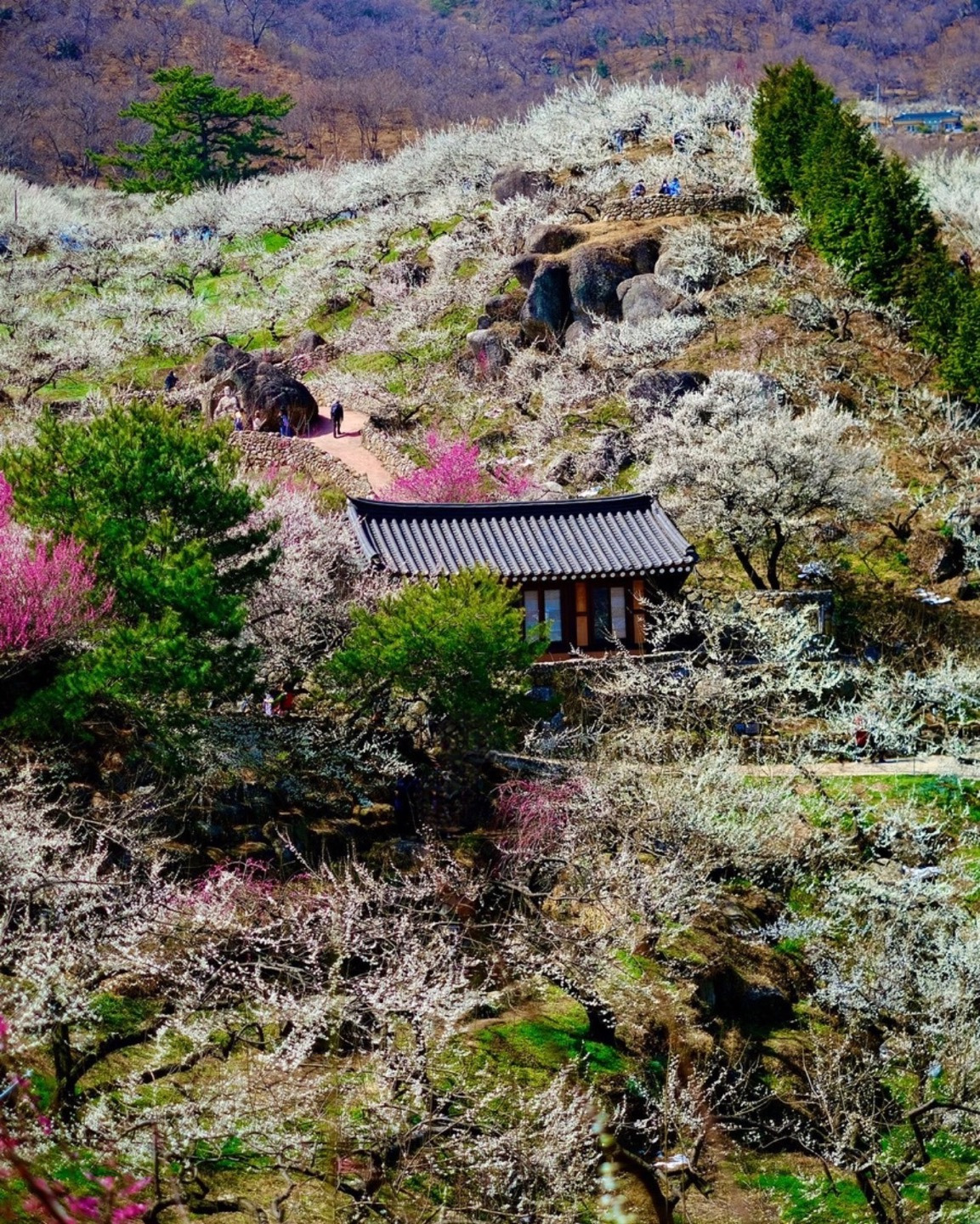 그동안 잘 몰랐는데 매화야말로 팝콘과 꼭 닮았다. 팝콘 강냉이 부분이 초록이거나 황토색이거나에 따라 청매실, 홍매실이 되는 건가. 내려오는 길 바람에 매화꽃잎이 날린다.