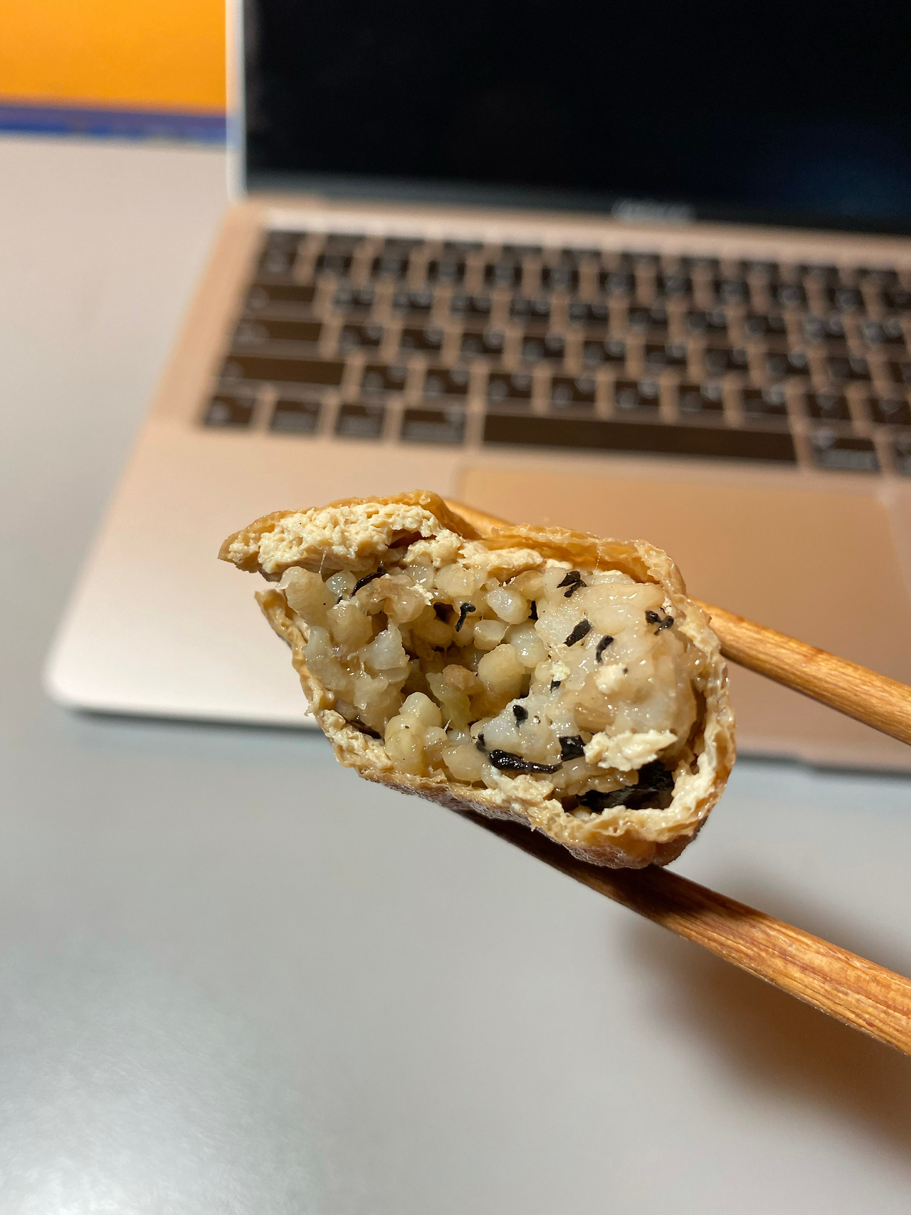 축축하지 않고 적당히 포슬 하게 맛이 밴 유부, 우엉, 무절임, 톳과 함께 단단히 뭉쳐진 흰쌀밥이다. 아주 조금 느껴지는 초와 간장의 맛, 씹을수록 나오는 우엉의 땅 맛과 향, 유부의 고소함, 오돌토돌 씹히는 무 절임의 조화가 아주 섬세하다. 단 맛, 짠 맛, 고소한 맛, 새콤한 맛, 식감 어느 하나 자신을 주인공이라 주장하지 않고 슴슴하게 어우러져 모두를 잘 살린 유부초밥이었는데, 유부 안에 밥을 꽉 채워 넣지 않은 점이 가장 인상적이다. 입구 부분은 일부러 조금 남겨두어 모두 베어 물었을 때, 밥이 많지도 적지도 않은 딱 적절한 수준이어서 감탄했다. 이른 아침임에도 문자를 보냈다.