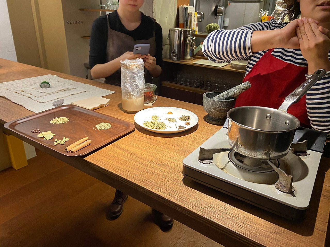 스파이스 워크숍은 수업 시작 전부터 개성을 주장하는 스파이스 향이 뜨뜻하게 손님을 환대합니다. 낮게 깔리는 묵직하고 편안한 나무 계열의 스파이스부터 화하고 상쾌하지만 마른 잎의 가벼운 향, 고소하며 향긋한 씨앗의 향, 생전 처음 보는 종류의 씨앗과 잎, 나무들이 줄지어 유리병에 잘 담겨있습니다. 그 사이에 까무잡잡한 피부와 동글동글한 얼굴, 선명한 눈빛의 송수가 있고, 스파이스만큼 넘치는 그의 생기는 한번 본 사람은 절대 잊을 수 없게끔 했습니다. 동그랗고 또렷한 발음의 어조로 많은 스파이스를 하나씩 설명해주는데, 각각의 기운과 향, 맛과 성질을 설명하는 것을 듣다 보면, 시간이 훌쩍 지나있고, 수업 후에 아주 강렬한 맛일 거라 예상하며 받아 든 탈리 플레이트는 너무나 온화한 맛이어서 되려 기억에 깊이 남았습니다. 탈리가 "인도 백반"이라는 점을 다시금 생각해보게끔 한 식사였죠. 후에 몇 가지 프로젝트와 일로 만나게 되면서 재밌고 맛있는 이야기를 가득 담은 송수와, 먹으면 늘 몽롱한 정신이 깨이고 몸이 따뜻해지는 커리가 참 닮아있다는 생각을 했습니다.