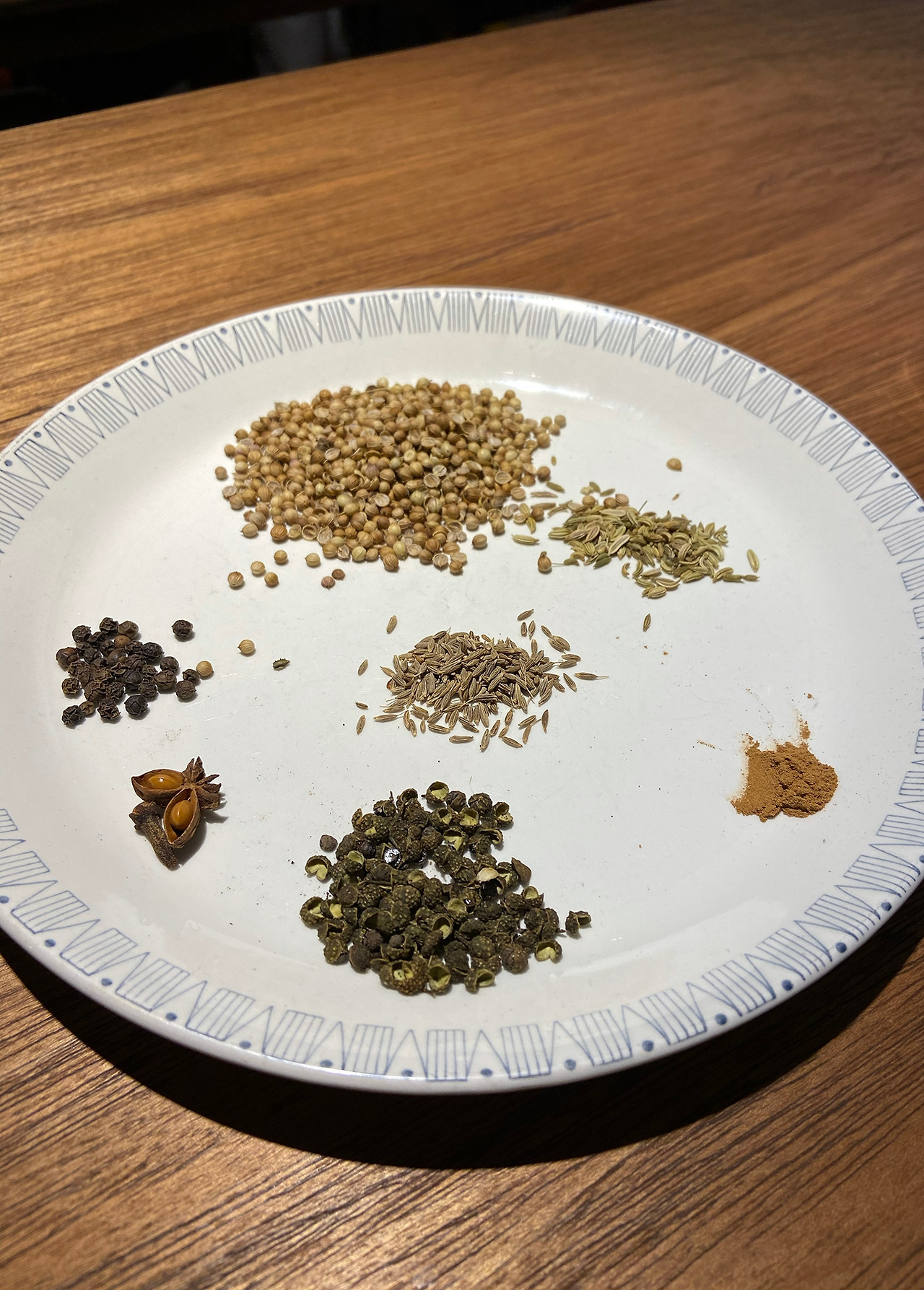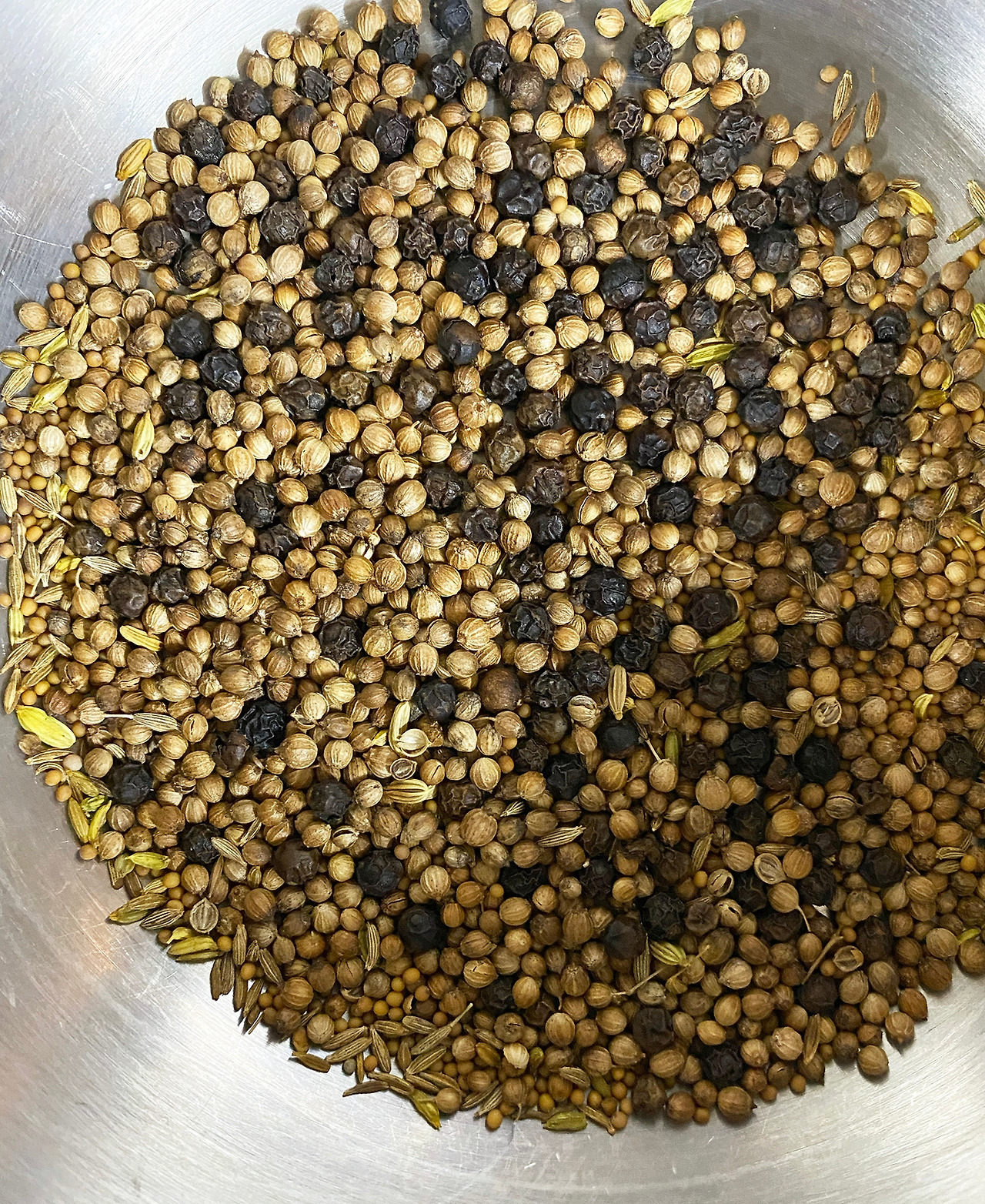 흑후추 > 고수씨 > 겨자씨 > 펜넬씨 > 큐민씨 순서로 각 향신료의 향이 올라오면 다음 향신료를 더하고 더하는 식으로 넣어 향신료를 볶습니다. 냄비를 들어 살살 굴려가며, 온도가 균일하게 향신료에 퍼지도록 합니다. 씨앗에 있는 수분을 날리고 고소한 맛을 올려줍니다. 냄새가 풍부해지면, 불을 끄고 접시에 둔 후 잠시 식힙니다.