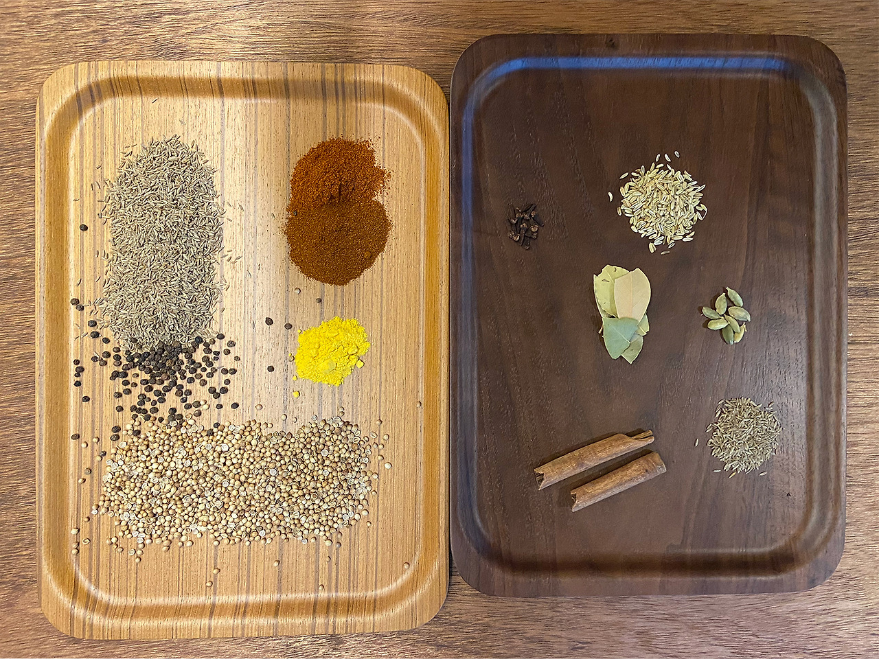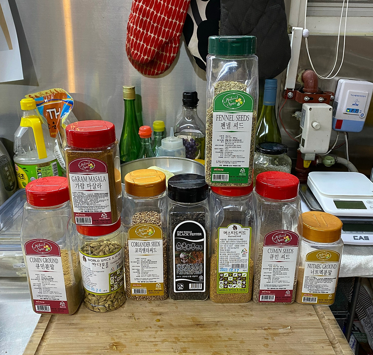송수의 워크숍을 기억하며 가지고 있는 스파이스 중 커리에 쓸 스파이스를 전적으로 기분과 선호에 따라 골랐습니다. 남아시아의 스파이스를 다루는 법이 아직 어색하고 서투르다고 생각해 좋아하는 고수씨, 펜넬씨, 큐민씨, 강황, 파프리카와 고추, 후추, 시나몬, 넛맥과 같이 비교적 익숙한 스파이스를 사용하였고, 많은 스파이스의 총체인 가람 마살라로 커리 맛을 보완했습니다.