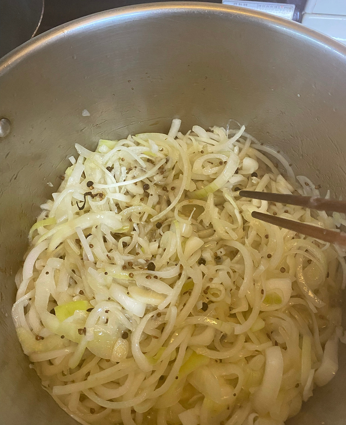 6) 바닥이 두꺼운 냄비에 기버터나 비건 버터 혹은 현미유를 넉넉히 두르고(바닥에서 2mm 정도), 굵게 빻은 향신료, 커리리프를 넣고 불을 켭니다. 약불에서 향신료 향이 올라오면, 채 썬 양파를 넣고 숨이 푹 죽을 정도이되 갈색이 나지 않은 정도로 볶습니다.