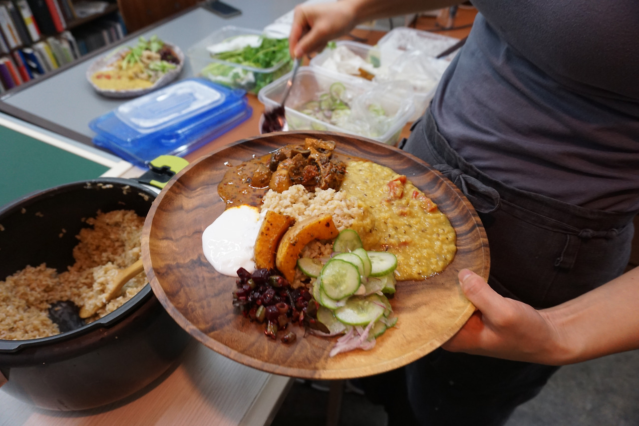 완성한 커리는 제법 맵습니다. 그런데 매운 것을 잘 못 먹는 사람이 만든 매운 커리라 잘 드시는 분들은 딱 좋다고 하시더라고요. 석류와 카이엔페퍼를 곁들여보았는데, 새콤하게 커리와 함께 씹히는 석류가 아주 잘 어울립니다. 반짝 식당 첫날에 커리 플레이팅을 할 때, 피타, 호밀빵, 가래떡을 놓아보았어요. 다양한 문화를 흡수한 송수를 생각하면서 다양한 문화권의 밥 같은 빵을 올리고 싶었거든요.