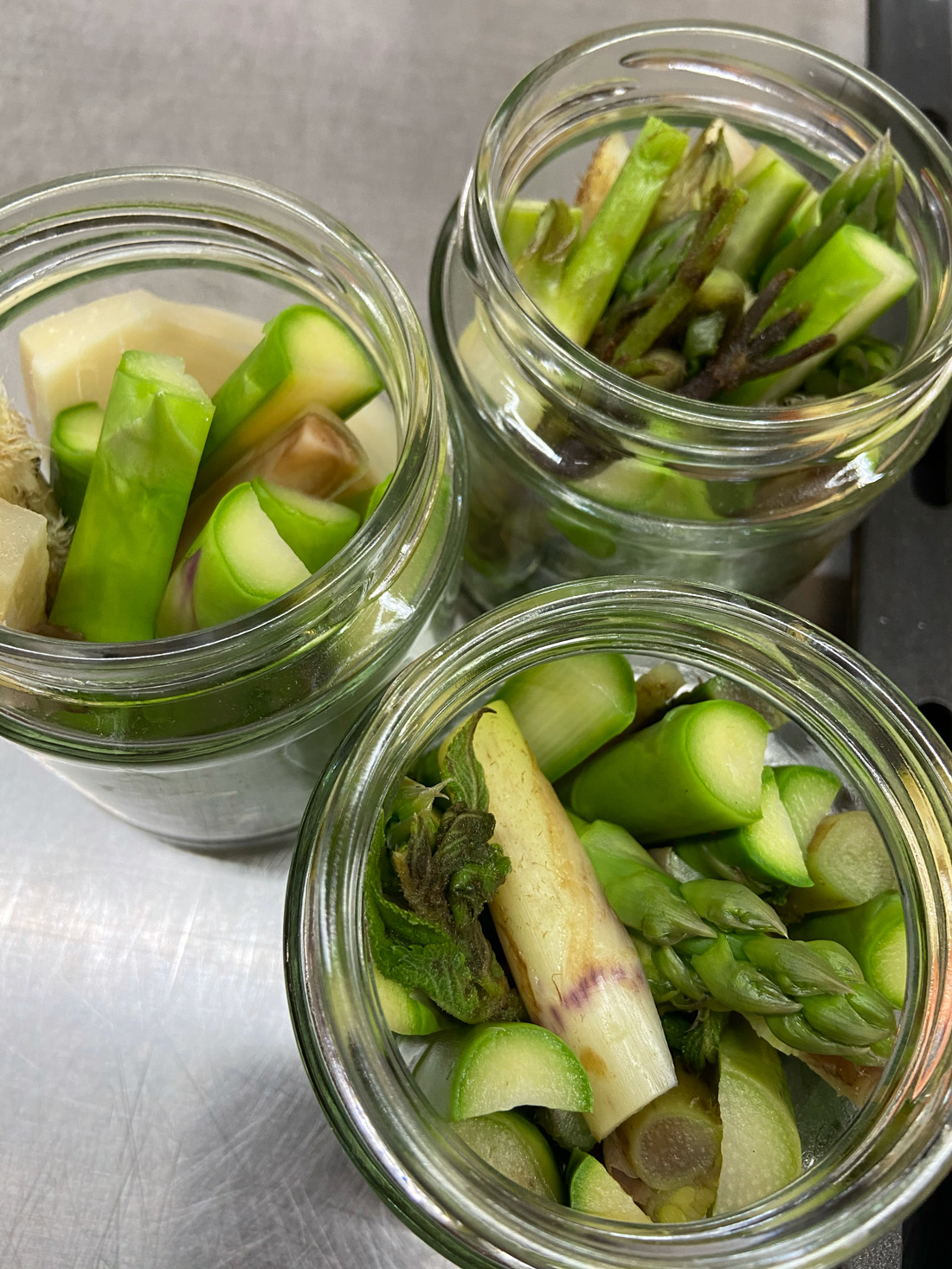 3. 끓는 물에 두릅과 아스파라거스를 살짝 데쳐 찬물에 씻고 물기를 적당히 제거하고, 병에 담는다.